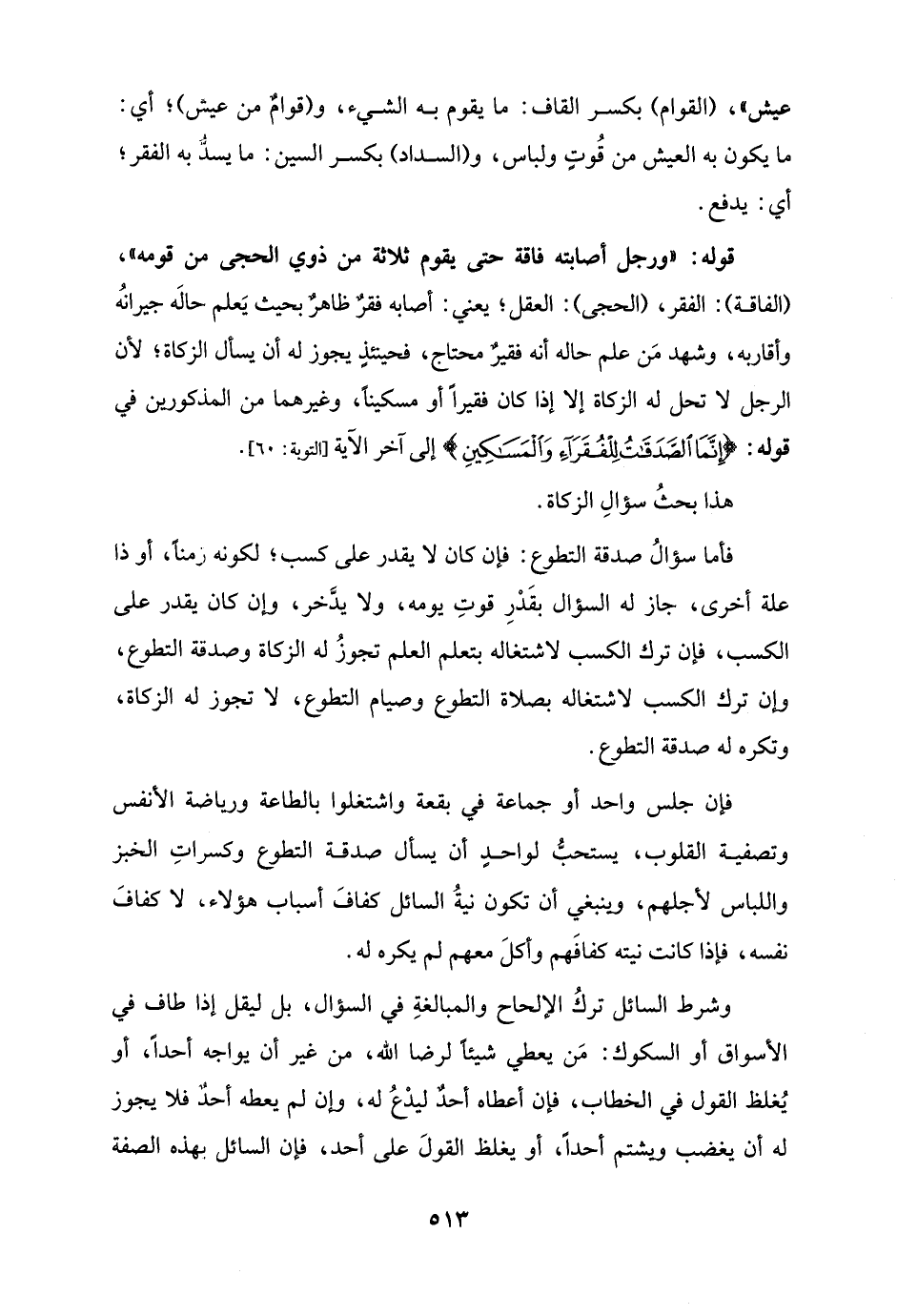 وشرط السائل تركُ الإلحاح والمبالغةِ في السؤال، بل ليقل إذا طاف في الأسواق أو السكوك: مَن يعطي شيئًا لرضا الله، من غير أن يواجه أحدًا، أو يُغلظ القول في الخطاب، فإن أعطاه أحدٌ ليدْعُ له، وإن لم يعطه أحدٌ فلا يجوز له أن يغضب ويشتم أحدًا، أو يغلظ القولَ على أحد، فإن السائل بهذه الصفة