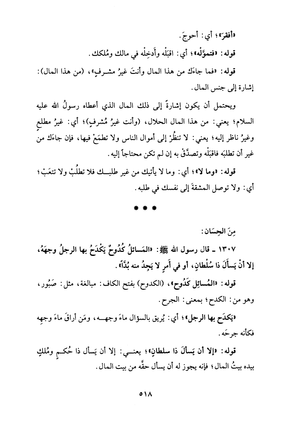 1307 - قال رسول الله - صلى الله عليه وسلم -: "المَسائلُ كُدُوحٌ يَكْدَحُ بها الرجلُ وجهَهُ، إلا أنْ يَسأَلَ ذا سُلْطانٍ، أو في أَمرٍ لا يَجِدُ منه بُدًّا".