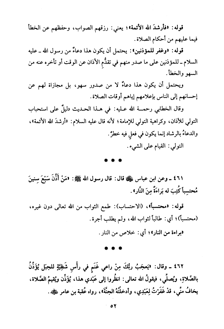 462 - وقال: "يَعجَبُ ربُّكَ مِنْ راعي غَنَمٍ في رأْسِ شَظِيَّةِ للجبَل يُؤَذِّنُ بالصَّلاةِ، ويُصلَّي، فيقولُ الله تعالى: انظُروا إلى عَبْدي هذا، يُؤَذَّن ويُقيمُ الصَّلاة، يخافُ منَّي، قدْ غَفَرْتُ لِعَبْدِي، وأدخلْتُهُ الجنَّةَ"، رواه عُقبة بن عامر - رضي الله عنه -.