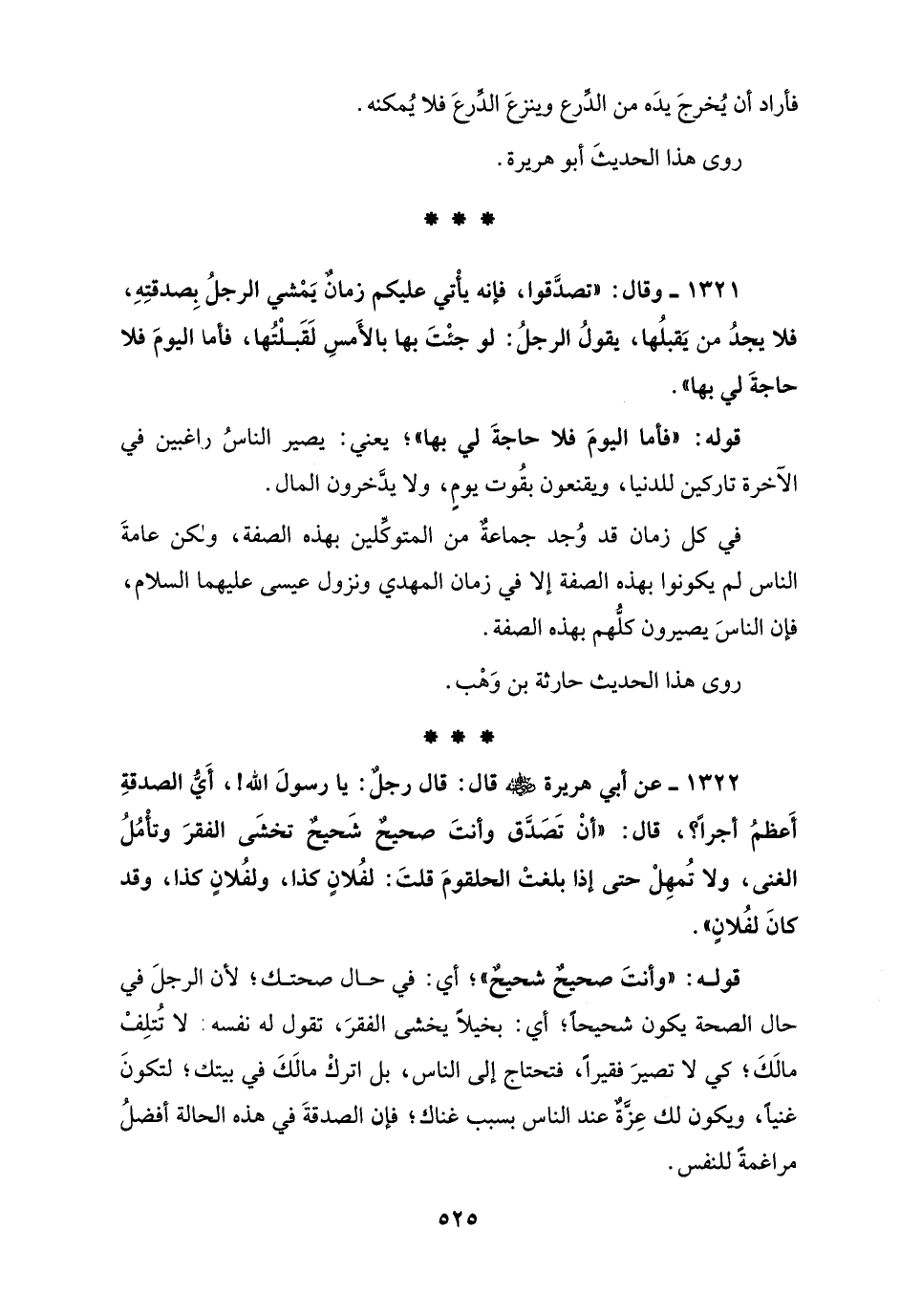 1322 - عن أبي هريرة - رضي الله عنه - قال: قال رجلٌ: يا رسولَ الله!، أَيُّ الصدقةِ أَعظمُ أجرًا؟، قال: "أنْ تَصَدَّق وأنتَ صحيحٌ شَحيحٌ تخشَى الفقرَ وتأْمُلُ الغنى، ولا تُمهِلْ حتى إذا بلغتْ الحلقومَ قلتَ: لفُلانٍ كذا، ولفُلانٍ كذا، وقد كانَ لفُلانٍ".