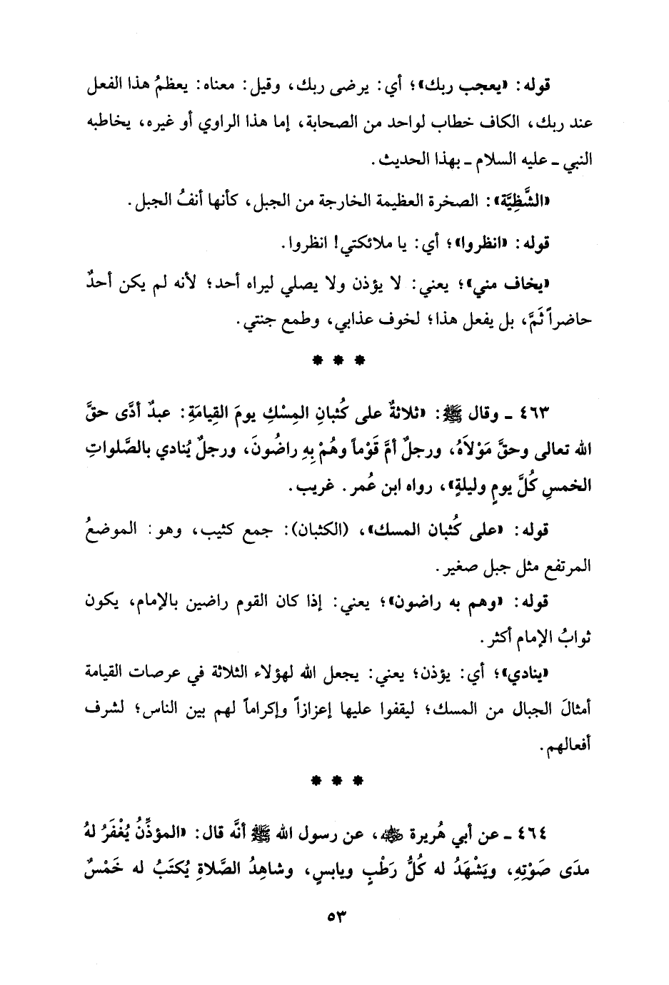 463 - وقال - صلى الله عليه وسلم -: "ثلاثةٌ على كُثبانِ المِسْكِ يومَ القِيامَةِ: عبدٌ أدَّى حقَّ الله تعالى وحقَّ مَوْلاَهُ، ورجلٌ أمَّ قَوْمًا وهُمْ بِهِ راضُونَ، ورجلٌ يُنادي بالصلواتِ الخمسِ كُلَّ يومٍ وليلةٍ"، رواه ابن عُمر. غريب.