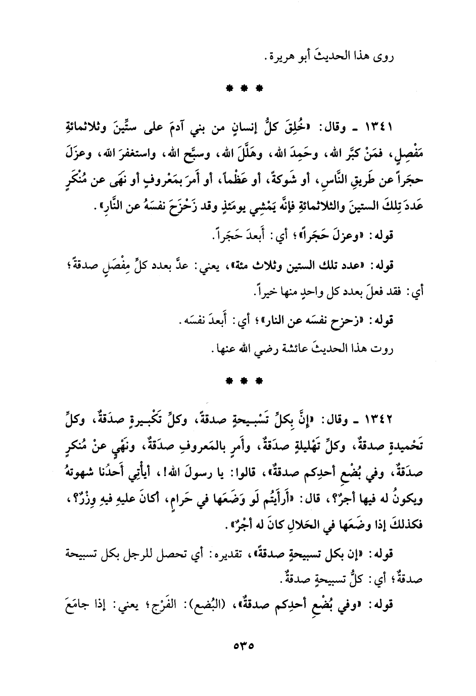 1341 - وقال: "خُلِقَ كلُّ إنسانٍ من بني آدمَ على ستِّينَ وثلاثمائةِ مَفْصِلٍ، فمَنْ كبَّر الله، وحَمِدَ الله، وهَلَّلَ الله، وسبَّح الله، واستغفرَ الله، وعزَلَ حجَراً عن طَريقِ النَّاسِ، أو شَوكةً، أو عَظْمًا، أو أَمرَ بمَعْروفٍ أو نَهَى عن مُنْكَرٍ عَددَ تِلكَ الستينَ والثلاثمائةِ فإنَّه يَمْشِي يومَئذٍ وقد زَحْزَحَ نفسَهُ عن النَّارِ".