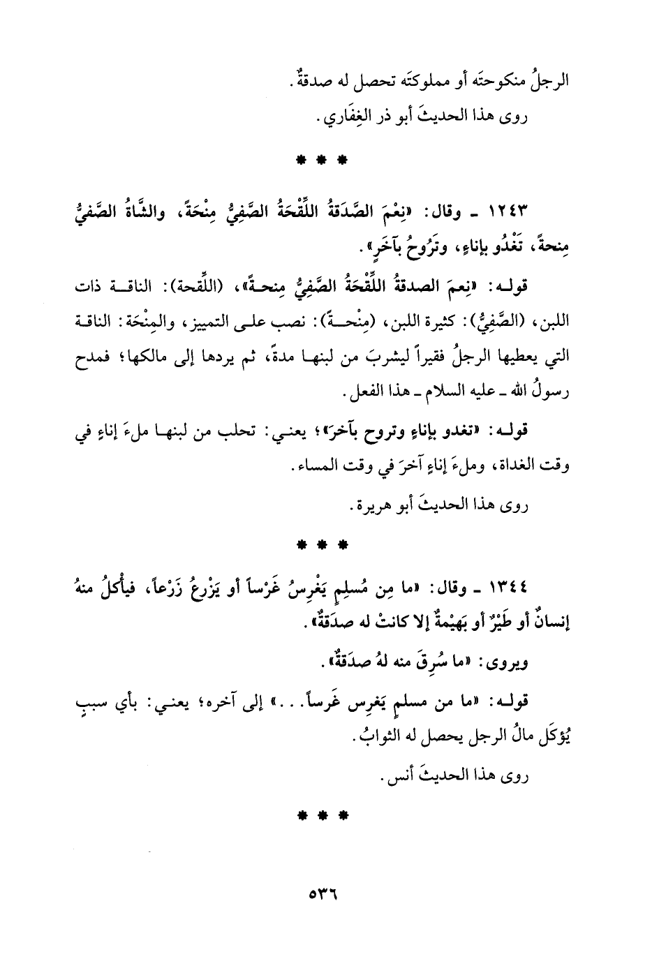 1243 - وقال: "نِعْمَ الصَّدَقةُ اللِّقْحَةُ الصَّفِيُّ مِنْحَةً، والشَّاةُ الصَّفيُّ مِنحةً، تَغْدُو بإناءٍ، وتَرُوحُ بآخَرٍ".