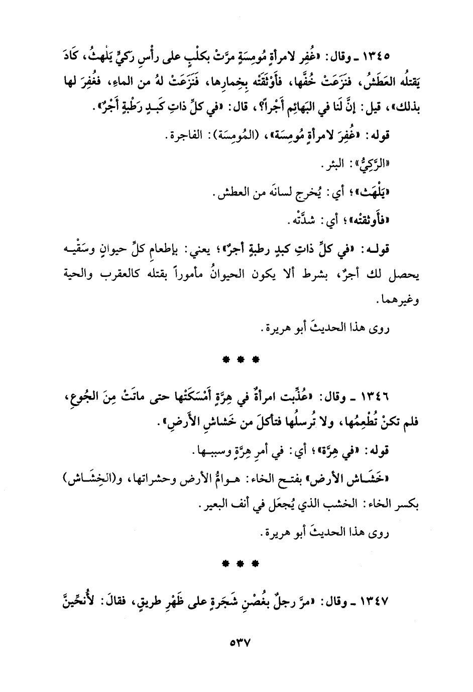 1346 - وقال: "عُذَّبت امرأةٌ في هِرَّةٍ أَمْسَكَتْها حتى ماتَتْ مِنَ الجُوعِ، فلم تكنْ تُطْعِمُها، ولا تُرسلُها فتأكلَ من خَشاشِ الأَرضِ".
