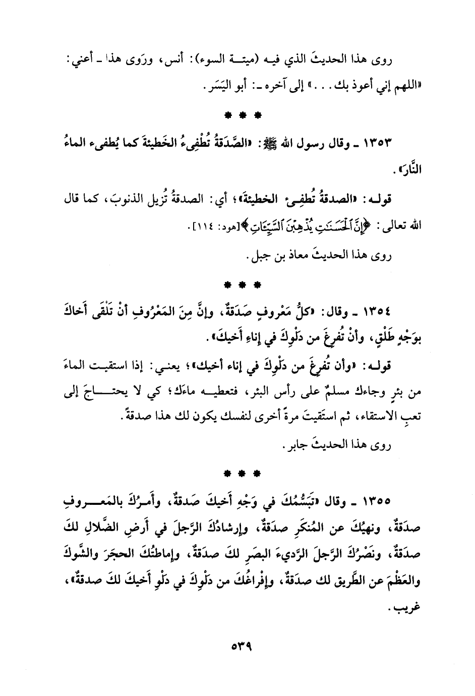1353 - وقال رسول الله - صلى الله عليه وسلم -: "الصَّدَقةُ تُطْفِئُ الخَطيئةَ كما يُطفئ الماءُ النَّارَ".