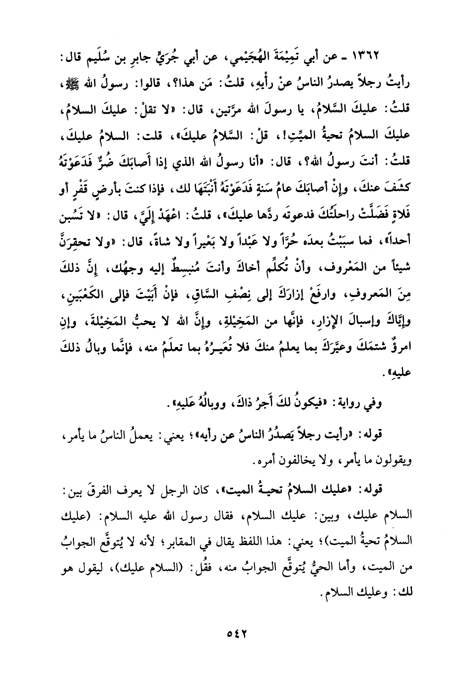 1362 - عن أبي تَمِيْمَةَ الهُجَيْمي، عن أبي جُرَيًّ جابرِ بن سُلَيم قال: رأيتُ رجلاً يصدرُ الناسُ عنْ رأْيهِ، قلتُ: مَن هذا؟، قالوا: رسولُ الله - صلى الله عليه وسلم - قلتُ: عليكَ السَّلامُ، يا رسولَ الله مرَّتين، قال: "لا تقلْ: عليكَ السلامُ، عليكَ السلامُ تحيةُ الميِّتِ!، قلْ: السَّلامُ عليكَ"، قلت: السلامُ عليكَ، قلتُ: أنتَ رسولُ الله؟، قال: "أنا رسولُ الله الذي إذا أَصابَكَ ضُرٌّ فَدَعَوْتَهُ كشَفَ عنكَ، وإِنْ أصابَكَ عامُ سَنةٍ فَدَعَوْتَهُ أَنْبَتَهَا لك، فإذا كنتَ بأرضٍ قَفْرٍ أو فَلاةٍ فَضَلَّتْ راحلَتُكَ فدعوتَه ردَّها عليكَ"، قلتُ: اعْهَدْ إِلَيَّ، قال: "لا تَسُبن أحدًا"، فما سبَبْتُ بعدَه حُرًّا ولا عَبْدًا ولا بَعْيرًا ولا شاةً، قال: "ولا تحقِرَنَّ شيئًا من المَعْروف، وأنْ تُكلِّم أخاكَ وأنتَ مُنبسِطٌ إليه وجهُك، إِنَّ ذلكَ مِنَ المَعروفِ، وارفَعْ إزارَكَ إلى نِصْفِ السَّاقِ، فإنْ أَبَيْتَ فإلى الكَعْبَينِ، وإيَّاكَ وإسبالَ الإِزارِ، فإنَّها من المَخِيْلةِ، وإِنَّ الله لا يحبُّ المَخِيْلةَ، وإنِ امرؤٌ شتمَكَ وعيَّرَكَ بما يعلمُ منكَ فلا تُعَيرُهُ بما تعلَمُ منه، فإنَّما وبالُ ذلكَ عليهِ".