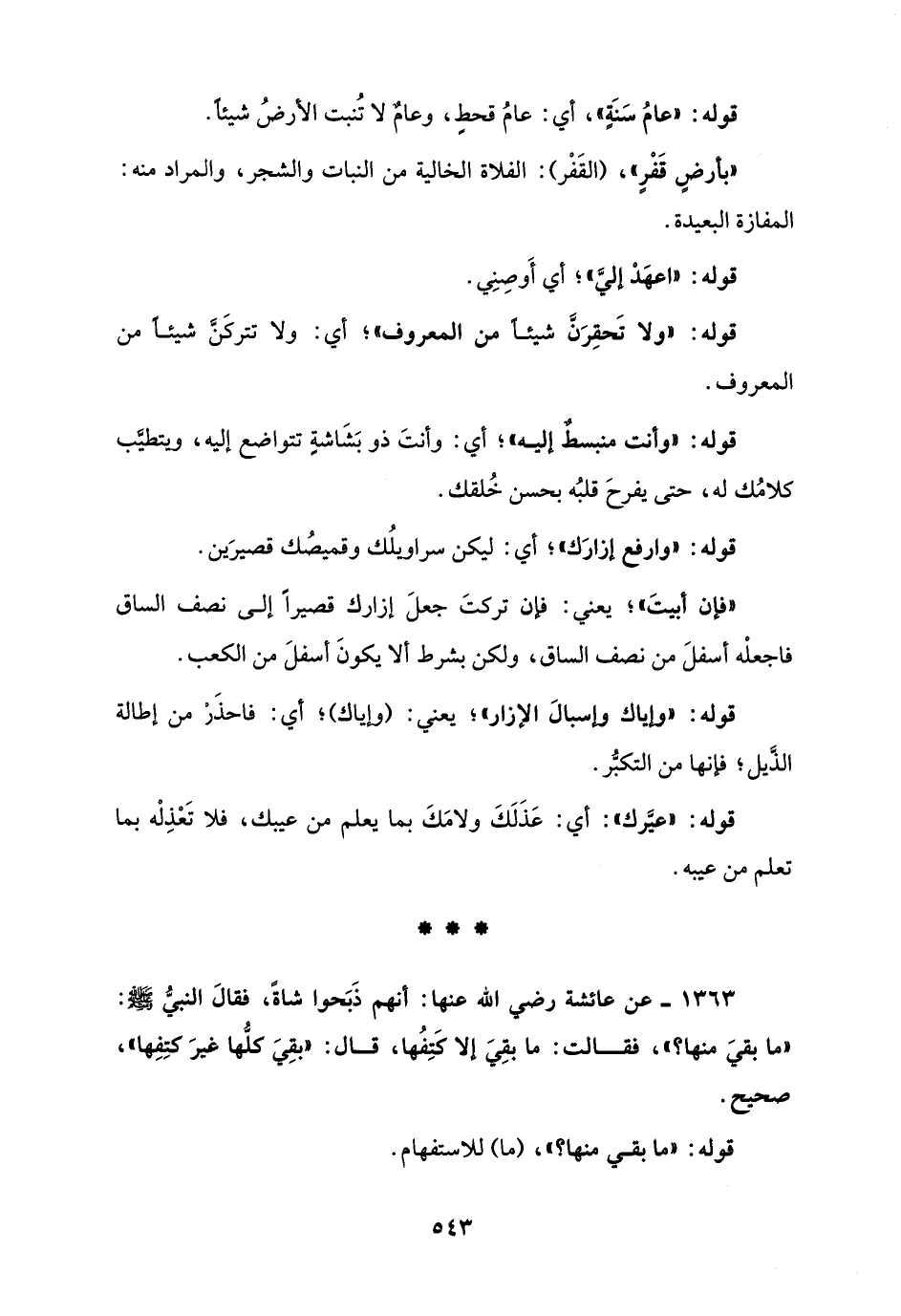 1363 - عن عائشة رضي الله عنها: أنهم ذَبَحوا شاةً، فقالَ النبيُّ - صلى الله عليه وسلم -: "ما بقيَ منها؟ "، فقالت: ما بقِيَ إلا كَتِفُها، قال: "بقِيَ كلُّها غيرَ كتِفِها"، صحيح.