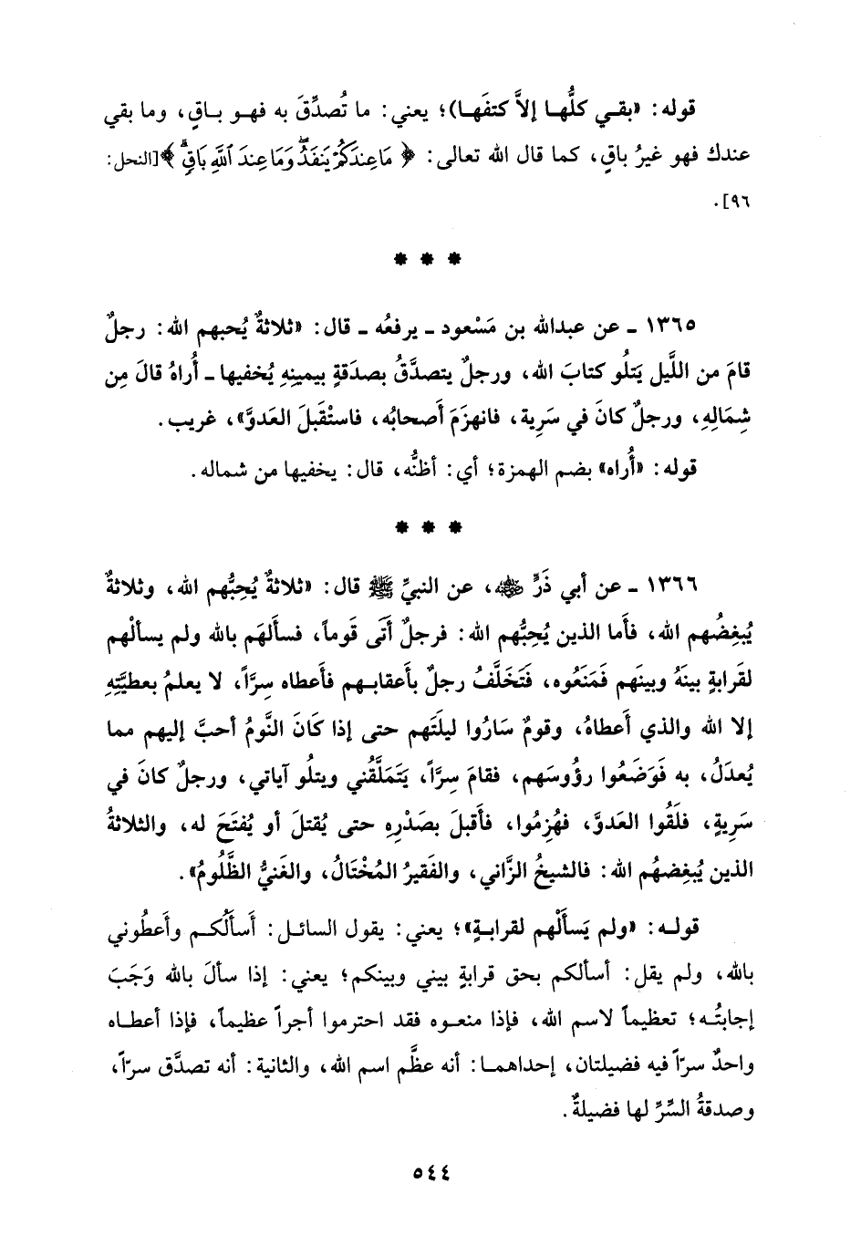 1366 - عن أبي ذَرًّ - رضي الله عنه -، عن النبيِّ - صلى الله عليه وسلم - قال: "ثلاثةٌ يُحِبُّهم الله، وثلاثةٌ يُبغِضُهم الله، فأَما الذين يُحِبُّهم الله: فرجلٌ أَتَي قَومًا، فسأَلهَم بالله ولم يسألْهم لقَرابةٍ بينَهُ وبينَهم فَمَنَعُوه، فتَخَلَّفُ رجلٌ بأَعقابهم فأعطاه سِرًّا، لا يعلمُ بعطيَّتِهِ إلا الله والذي أَعطاهُ، وقومٌ سَارُوا ليلَتَهم حتى إذا كَانَ النَّومُ أحبَّ إليهم مما يُعدَلُ، به فَوَضَعُوا رؤُوسَهم، فقامَ سِرًّا، يتمَلَّقُني ويتلُو آياتي، ورجلٌ كانَ في سَرِيةٍ، فلَقُوا العَدوَّ، فهُزِمُوا، فأَقبلَ بصَدْرِهِ حتى يُقتلَ أو يُفتَحَ له، والثلاثةُ الذين يُبغِضهُم الله: فالشيخُ الزَّاني، والفَقيرُ المُخْتَالُ، والغَنيُّ الظَّلُومُ".