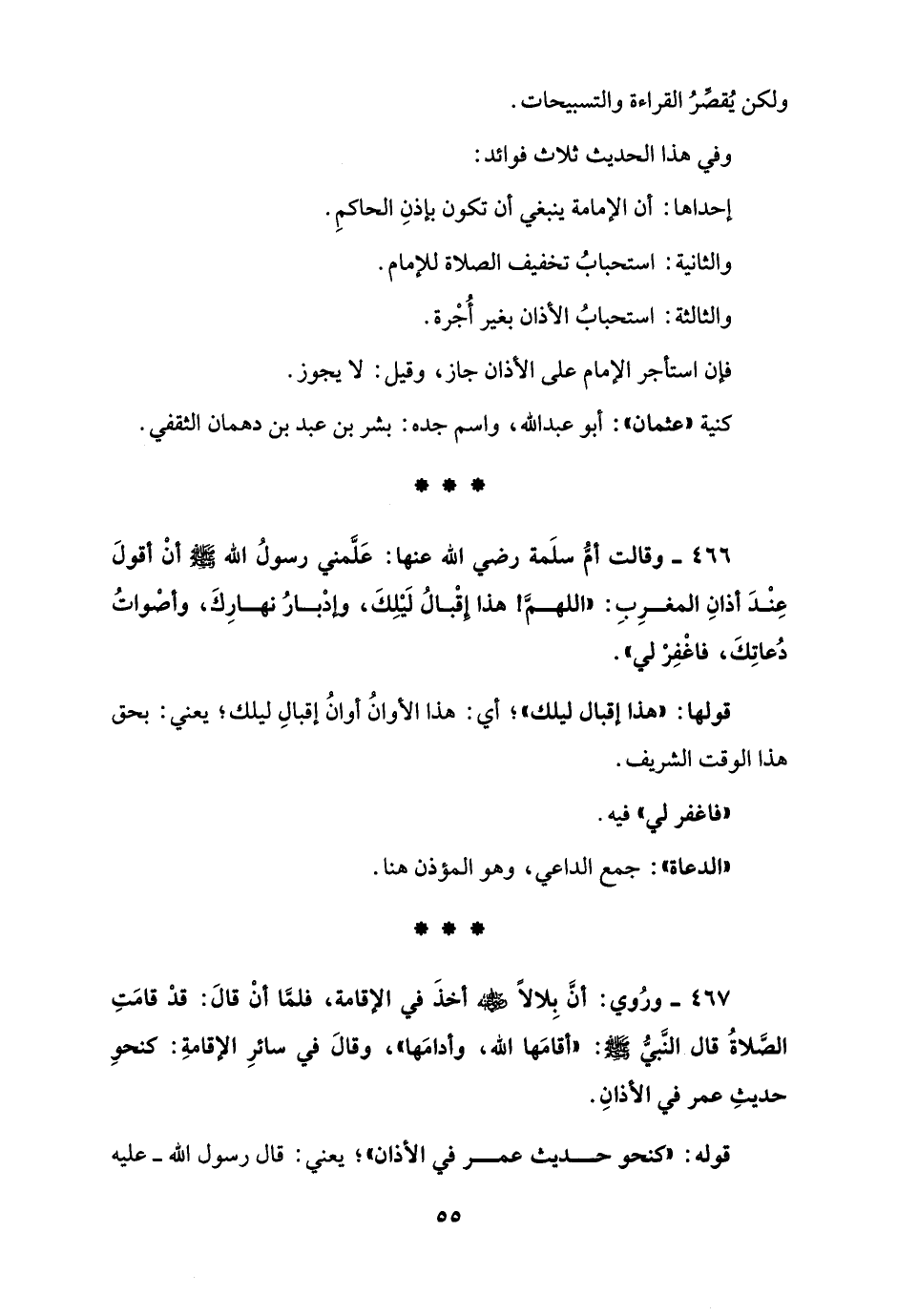 467 - ورُوي: أنَّ بِلالاً - رضي الله عنه - أخذَ في الإقامة، فلمَّا أنْ قالَ: قدْ قامَتِ الصَّلاةُ قال النَّبيُّ - صلى الله عليه وسلم -: "أقامَها الله، وأدامَها"، وقالَ في سائرِ الإقامةِ: كنحوِ حديثِ عمر في الأذانِ.
