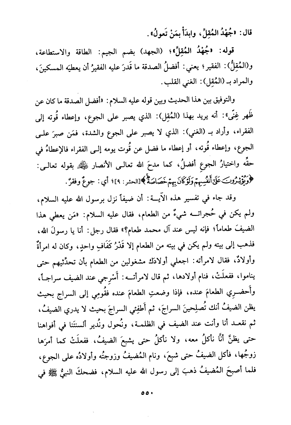 وقد جاء في تفسير هذه الآية: أن ضيفًا نزل برسول الله عليه السلام، ولم يكن في حُجراته شيءٌ من الطعام، فقال عليه السلام: "مَن يعطي هذا الضيفَ طعامًا؛ فإنه ليس عند آل محمد طعام؟ " فقال رجل: أنا يا رسولَ الله، فذهب إلى بيته ولم يكن في بيته من الطعام إلا قَدْرُ كَفَافِ واحدٍ، وكان له امرأةٌ وأولادٌ، فقال لامرأته: اجعلي أولادك مشغولين من الطعام بأن تحدِّثيهم حتى يناموا، ففعلَتْ، فنام أولادها، ثم قال لامرأته: أَسْرِجي عند الضيف سراجًا، وأَحضرِي الطعامَ عنده، فإذا وضعتِ الطعامَ عنده فقُومِي إلى السراج بحيث يظن الضيفُ أنك تُصلِحينَ السراجَ، ثم أَطفِئي السراجَ بحيث لا يدري الضيفُ، ثم نقعد أنا وأنت عند الضيف في الظلمة، ونُحول ونُدير ألسنتَنا في أفواهنا حتى يظنَّ أنَّا نأكلُ معه، ولا نأكلُ حتى يشبعَ الضيفُ، ففعلَتْ كما أمرَها زوجُها، فأكل الضيفُ حتى شبعَ، ونام المُضيفُ وزوجتُه وأولادُه على الجوع، فلما أصبحَ المُضيفُ ذهبَ إلى رسول الله عليه السلام، فضحكَ النبيُّ - صلى الله عليه وسلم - في