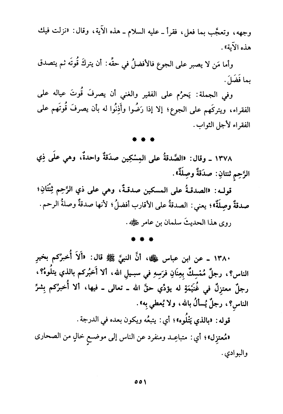 1380 - عن ابن عباس - رضي الله عنهما -، أنَّ النبيَّ - صلى الله عليه وسلم - قال: "أَلاَ أُخبرُكم بخيرِ الناس؟، رجلٌ مُمْسِكٌ بِعِنَانِ فرَسِهِ في سبيلِ الله، ألا أَخبُركم بالذي يتلُوهُ؟، رجلٌ معتزِلٌ في غُنَيْمَةٍ له يؤدَّي حقَّ الله - تعالى - فيها، ألا أُخبرُكم بِشرِّ الناسِ؟، رجلٌ يُسألُ بالله، ولا يُعطي بِه".