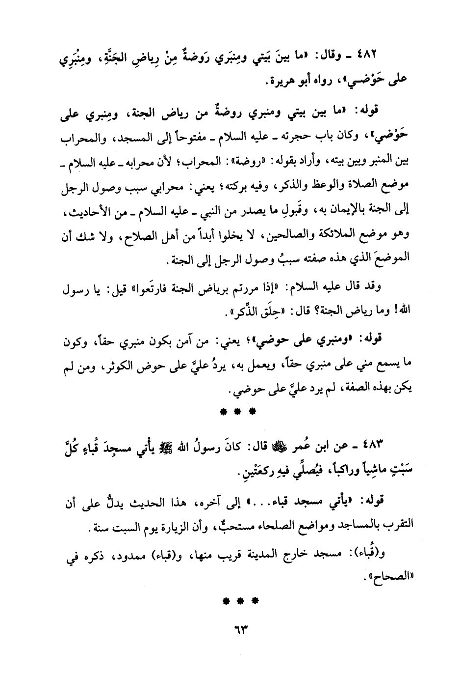 483 - عن ابن عُمر - رضي الله عنهما - قال: كانَ رسولُ الله - صلى الله عليه وسلم - يأْتي مسجِدَ قُباءٍ كُلَّ سَبْتٍ ماشِيًا وراكبًا، فيُصلِّي فيهِ ركعَتْينِ.