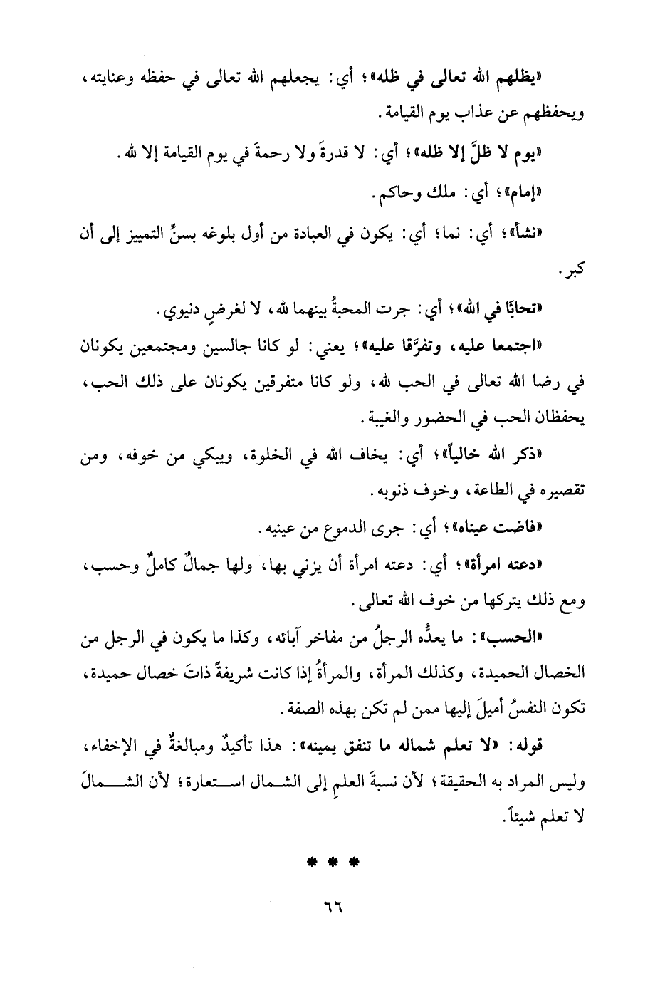 قوله: "لا تعلم شماله ما تنفق يمينه": هذا تأكيدٌ ومبالغةٌ في الإخفاء، وليس المراد به الحقيقة؛ لأن نسبةَ العلمِ إلى الشمال استعارة؛ لأن الشمالَ لا تعلم شيئًا.