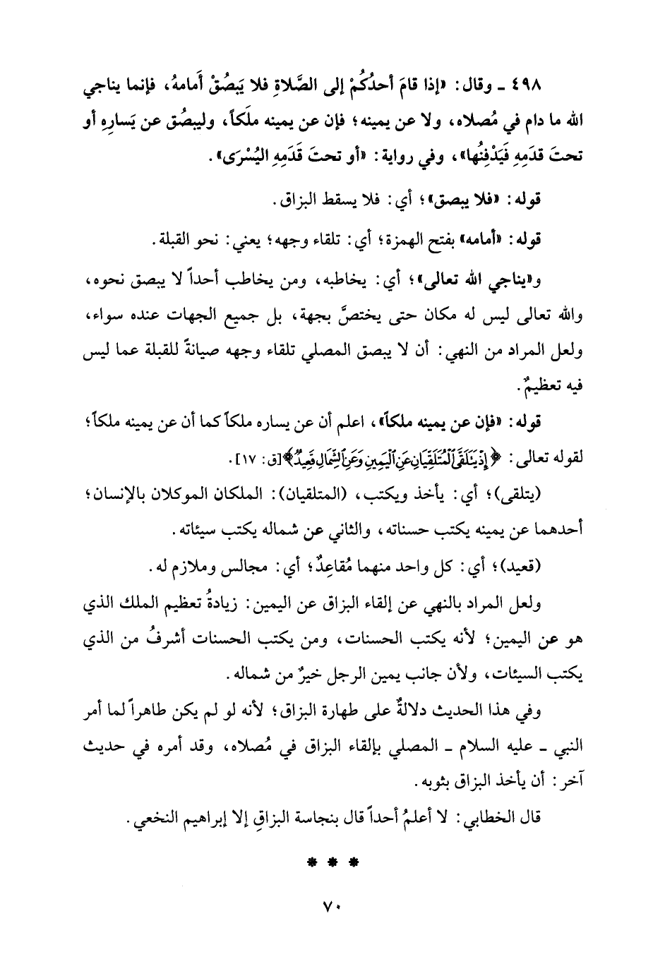 498 - وقال: "إذا قامَ أحدُكُمْ إلى الصَّلاةِ فلا يَبصُقْ أَمامهُ، فإنما يناجي الله ما دام في مُصلاه، ولا عن يمينه؛ فإن عن يمينه ملَكًا، وليبصُق عن يَسارِهِ أو تحتَ قدَمِهِ فَيَدْفِنُها"، وفي رواية: "أو تحتَ قَدَمِهِ اليُسْرَى".