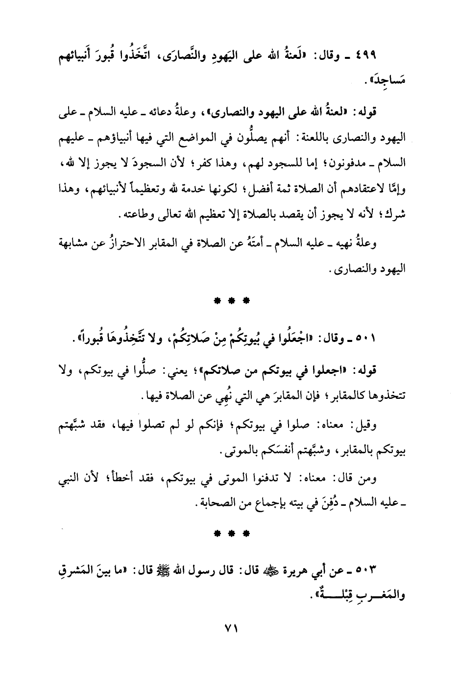 499 - وقال: "لَعنةُ الله على اليَهودِ والنَّصارَى، اتَّخَذُوا قُبورَ أَنبيائهم مَساجِدَ".
