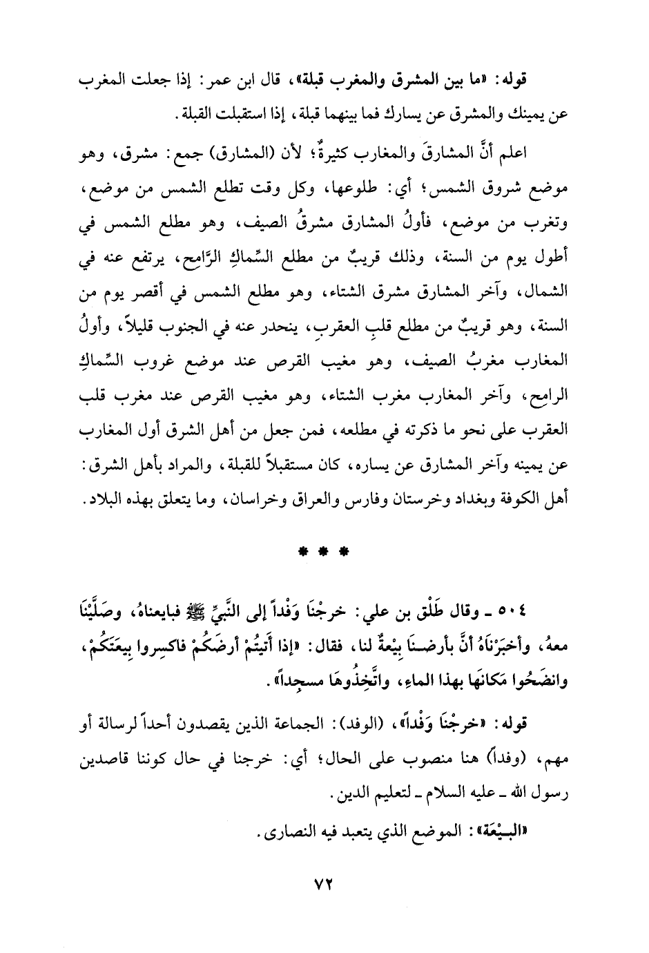504 - وقال طَلْق بن علي: خرجْنَا وَفْدًا إلى النَّبيِّ - صلى الله عليه وسلم - فبايعناهُ، وصَلَّيْنَا معهُ، وأخبَرْنَاهُ أنَّ بأرضنَا بِيْعةٌ لنا، فقال: "إذا أَتيتُمْ أرضَكُمْ فاكسِروا بِيعَتَكُمْ، وانضَحُوا مَكانَها بهذا الماءِ، واتَّخِذُوهَا مسجِدًا".