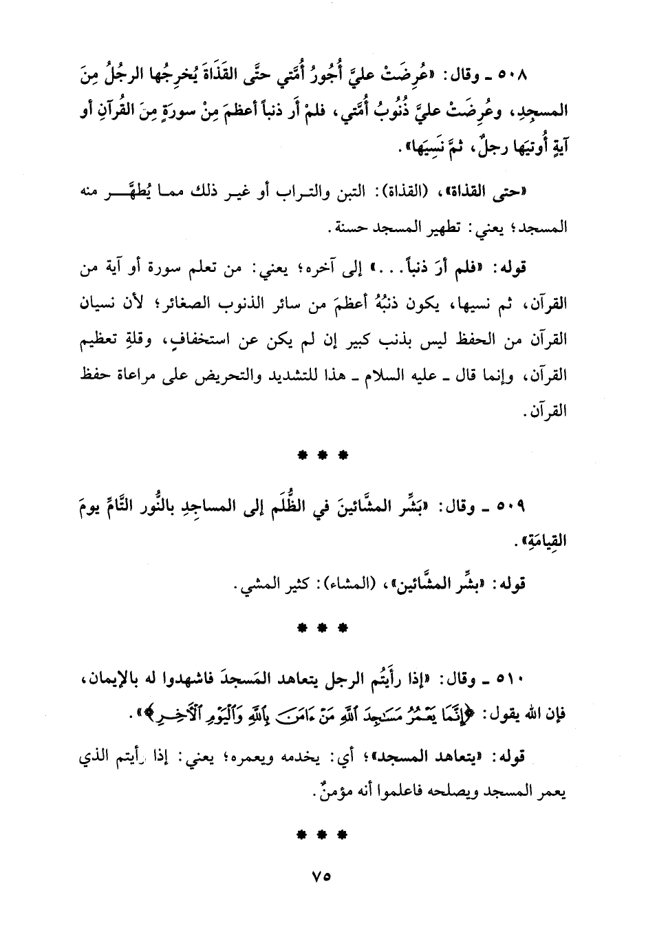508 - وقال: "عُرِضَتْ عليَّ أُجُورُ أُمَّتي حتَّى القَذَاةَ يُخرِجُها الرجُلُ مِنَ المسجِدِ، وعُرِضَتْ عليَّ ذُنُوبُ أُمَّتي، فلمْ أَر ذنبًا أعظمَ مِنْ سورَةٍ مِنَ القُرآنِ أو آيةٍ أُوتيَها رجلٌ، ثمَّ نسِيَها".