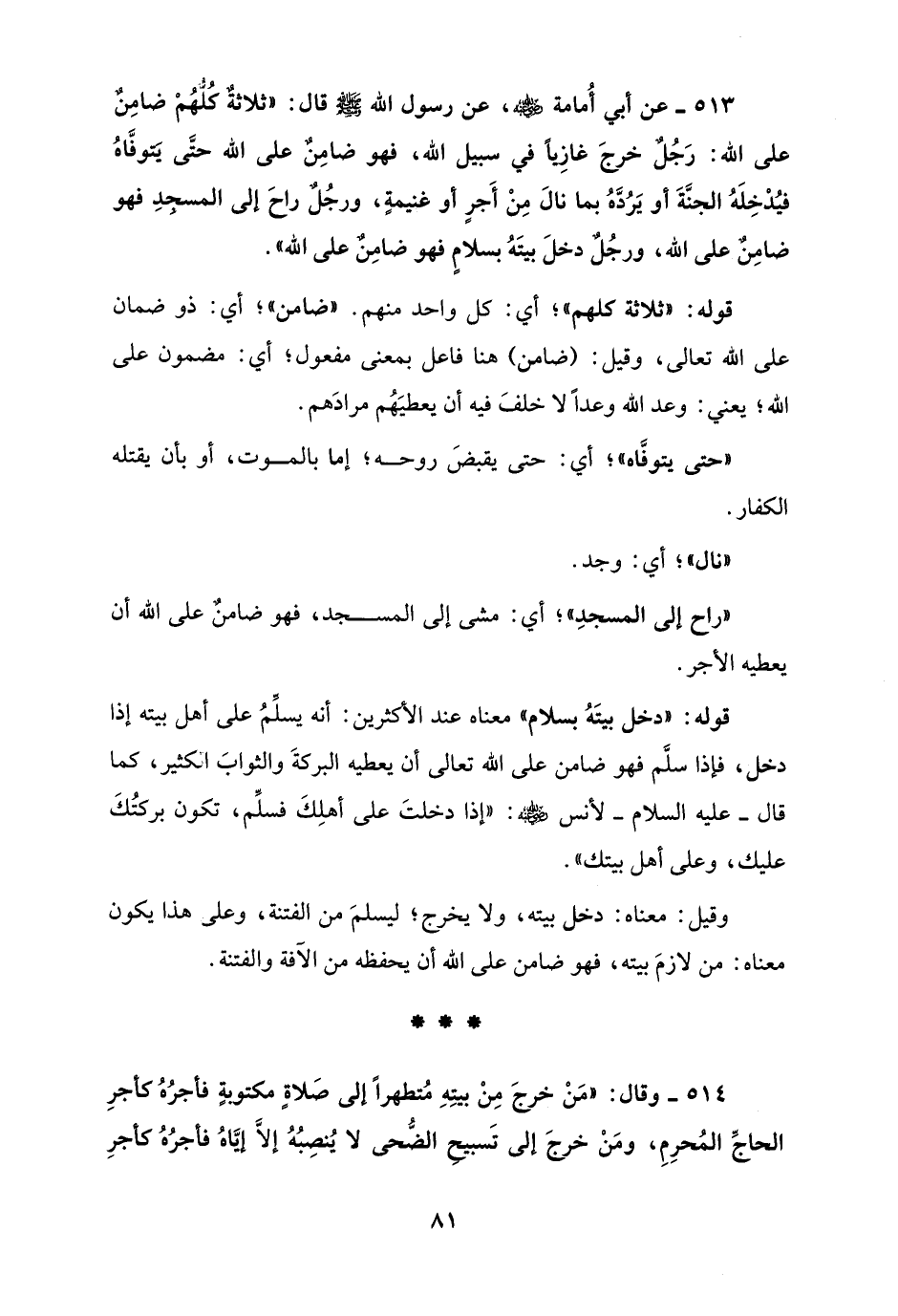 513 - عن أبي أُمامة - رضي الله عنه -، عن رسول الله - صلى الله عليه وسلم - قال: "ثلاثةٌ كُلهُمْ ضامِنٌ على الله: رَجُلٌ خرجَ غازِيًا في سبيل الله، فهو ضامِنٌ على الله حتَّى يَتوفَّاهُ فيُدْخِلَهُ الجنَّةَ أو يَرُدَّهُ بما نالَ مِنْ أَجرٍ أو غنيمةٍ، ورجُلٌ راحَ إلى المسجِدِ فهو ضامِنٌ على الله، ورجُلٌ دخلَ بيتَهُ بسلامٍ فهو ضامِنٌ على الله".