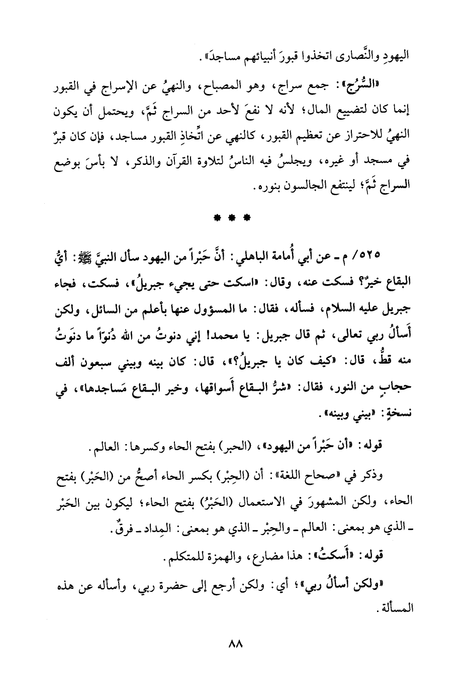 525/ م - عن أبي أُمامة الباهلي: أنَّ حَبْرًا من اليهود سأل النبيَّ - صلى الله عليه وسلم -: أيُّ البقاع خيرٌ؟ فسكت عنه، وقال: "اسكت حتى يجيء جبريلُ"، فسكت، فجاء جبريل عليه السلام، فسأله، فقال: ما المسؤول عنها بأعلم من السائل، ولكن أَسألُ ربي تعالى، ثم قال جبريل: يَا محمد! إنِّي دنوتُ من الله دُنوًّا ما دنوَتُ منه قطُّ، قال: "كيف كان يَا جبريلُ؟ "، قال: كان بينه وبيني سبعون ألف حجابٍ من النور، فقال: "شرُّ البقاع أَسواقها، وخير البقاع مَساجدها"، في نسخةٍ: "بيني وبينه".