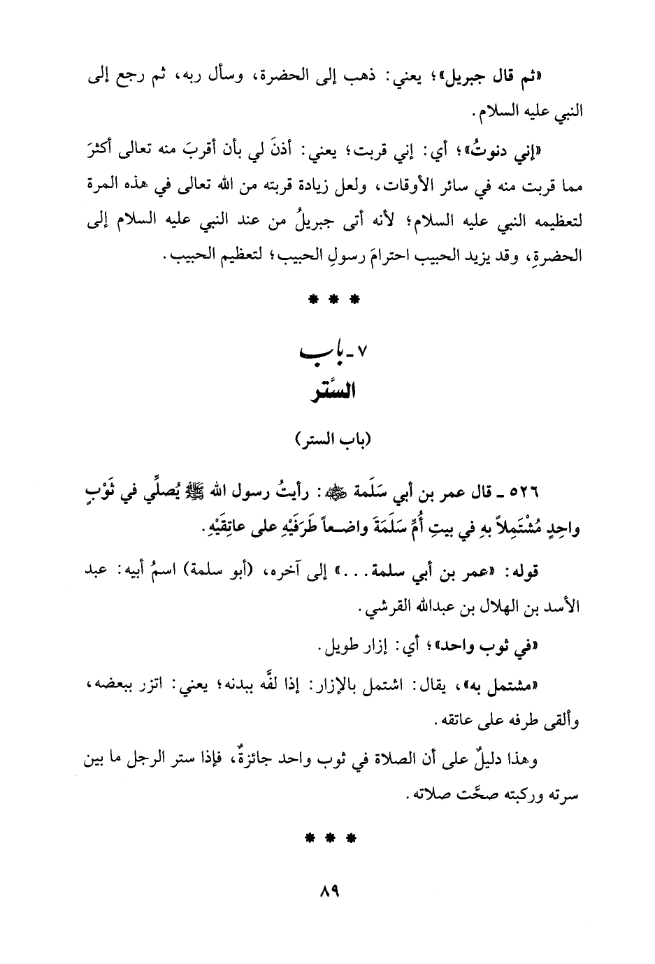526 - قال عمر بن أبي سَلَمة - رضي الله عنه -: رأيتُ رسول الله - صلى الله عليه وسلم - يُصلِّي في ثَوْبٍ واحِدٍ مُشْتَمِلًا بهِ في بيتِ أُمِّ سَلَمَةَ واضعًا طَرَفَيْهِ على عاتِقَيْهِ.