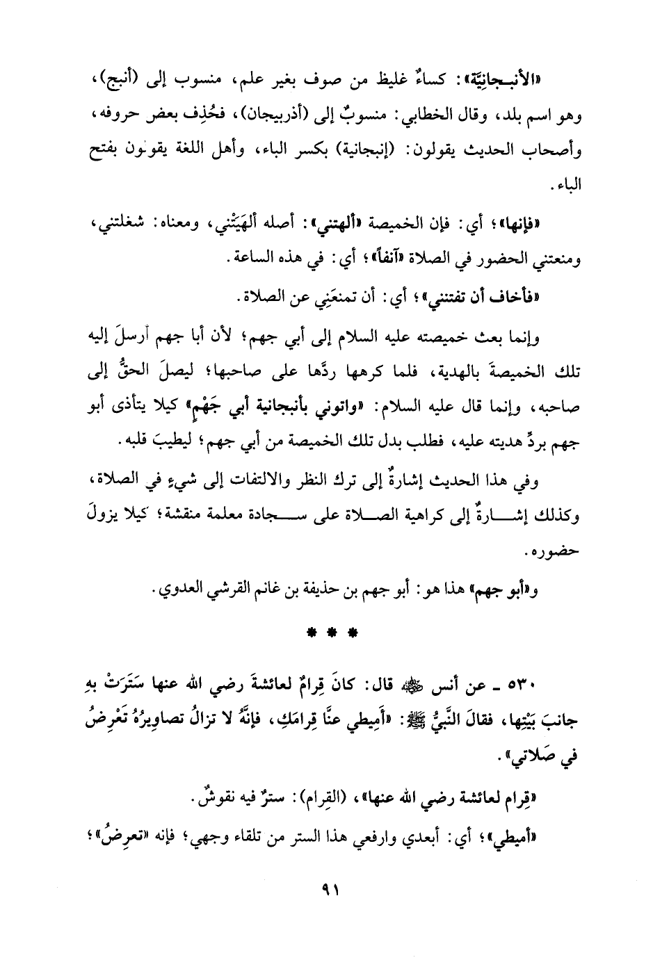 وفي هذا الحديث إشارةٌ إلى ترك النظر والالتفات إلى شيءٍ في الصلاة، وكذلك إشارةٌ إلى كراهية الصلاة على سجادة معلمة منقشة؛ كيلا يزولَ حضوره.