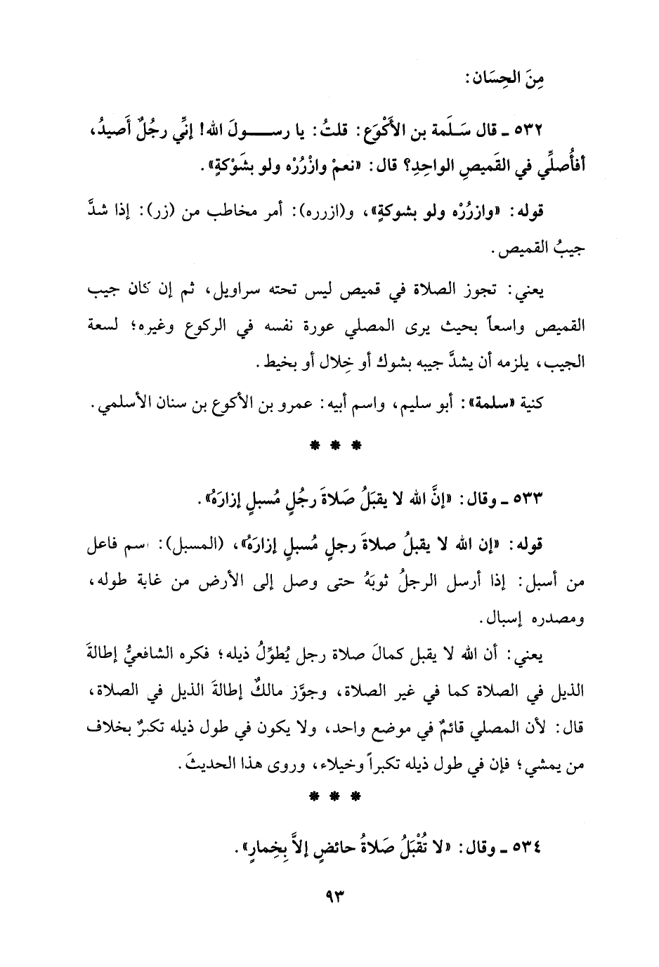 532 - قال سَلَمة بن الأَكْوَع: قلتُ: يَا رسولَ الله! إنِّي رجُلٌ أَصيدُ، أفأُصلِّي في القَميصِ الواحِدِ؟ قال: "نعمْ وازْرُرْه ولو بشَوْكةٍ".