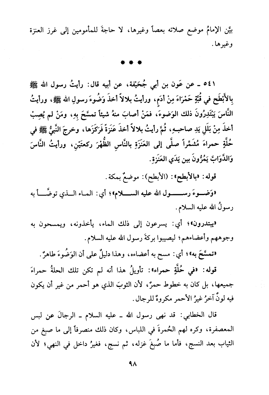 541 - عن عَون بن أبي جُحَيْفة، عن أَبيه قال: رأيتُ رسول الله - صلى الله عليه وسلم - بِالأَبْطَح في قُبَّةٍ حَمْرَاءَ مِنْ أدَمٍ، ورأيتُ بلالًا أَخَذَ وَضُوءَ رسولِ الله - صلى الله عليه وسلم -، ورأيتُ النَّاسَ يَبْتَدِرُونَ ذلك الوَضوءَ، فمَنْ أصابَ منهُ شيئًا تمسَّحَ بِهِ، ومَنْ لم يُصِبْ أَخَذَ مِنْ بَلَلِ يَدِ صاحبهِ، ثُمَّ رأيتُ بلالًا أَخَذَ عَنَزةً فَرَكَزَها، وخرجَ النَّبيُّ - صلى الله عليه وسلم - في حُلَّةٍ حمراءَ مُشَمِّرًا صلَّى إلى العَنَزَةِ بالنَّاسِ الظُّهْرَ ركعتَيْنِ، ورأيتُ النَّاسَ وَالدَّوَابَّ يَمُرُّونَ بين يَدَي العَنَزةِ.