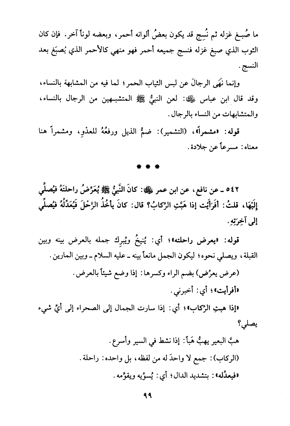 542 - عن نافع، عن ابن عمر - رضي الله عنهما -: كانَ النَّبيُّ - صلى الله عليه وسلم - يُعَرِّضُ راحلتَهُ فيُصلِّي إِلَيْهَا، قلتُ: أفَرَأَيْت إذا هَبَّتِ الرِّكابُ؟ قال: كانَ يأخُذُ الرَّحْلَ فَيُعَدِّلُهُ فيُصلِّي إلى آخِرَتِهِ.