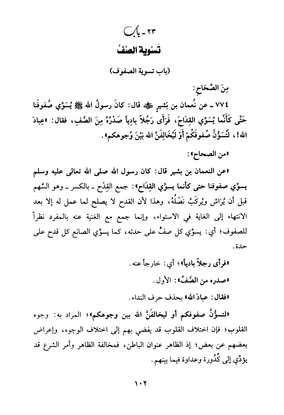 774 - عن نُعمان بن بَشيرٍ - رضي الله عنه - قال: كانَ رسُولُ الله - صلى الله عليه وسلم - يُسَوِّي صُفوفَنا حَتَّى كَأَنَّما يُسَوِّي القِدَاحَ، فَرَأَى رَجُلًا بادِيًا صَدْرُهُ مِنَ الصَّفِ، فقال: "عِبادَ الله!، لَتُسَوُّنَّ صُفوفَكُمْ أَوْ لَيُخَالِفَنَّ الله بَيْنَ وُجوهكم".