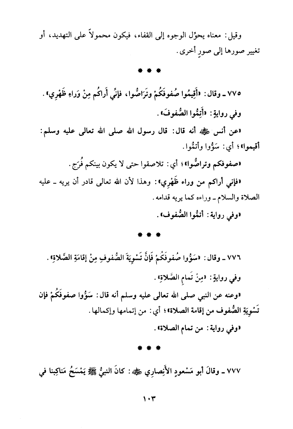 775 - وقال: "أَقِيمُوا صُفوفَكُمْ وتَرَاصُّوا، فإنِّي أَراكُم مِنْ وَراءِ ظَهْرِي".