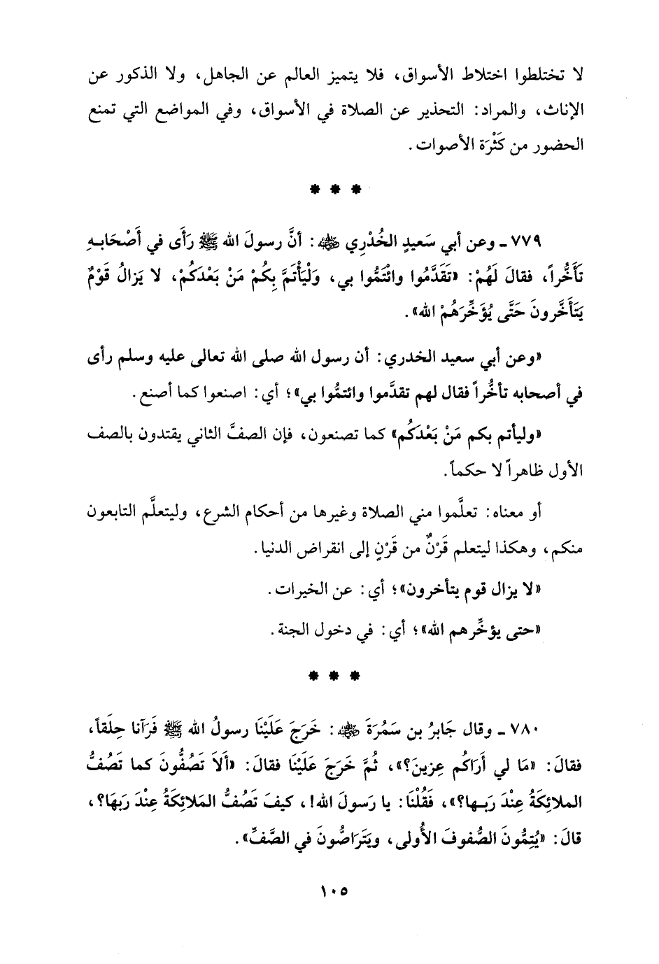 780 - وقال جَابرُ بن سَمُرَةَ - رضي الله عنه -: خَرَجَ عَلَيْنَا رسولُ الله - صلى الله عليه وسلم - فَرَآنَا حِلَقًا، فقالَ: "مَا لي أَرَاكُم عِزينَ؟ "، ثُمَّ خَرَجَ عَلَيْنَا فقالَ: "أَلَا تَصُفُّونَ كما تَصُفُّ الملائِكَةُ عِنْدَ رَبها؟ "، فَقُلْنَا: يا رَسولَ الله!، كَيفَ تَصُفُّ المَلائِكَةُ عِنْدَ رَبهَا؟، قالَ: "يُتِمُّونَ الصُّفوفَ الأُولى، ويَتَرَاصُّونَ في الصَّفِّ".