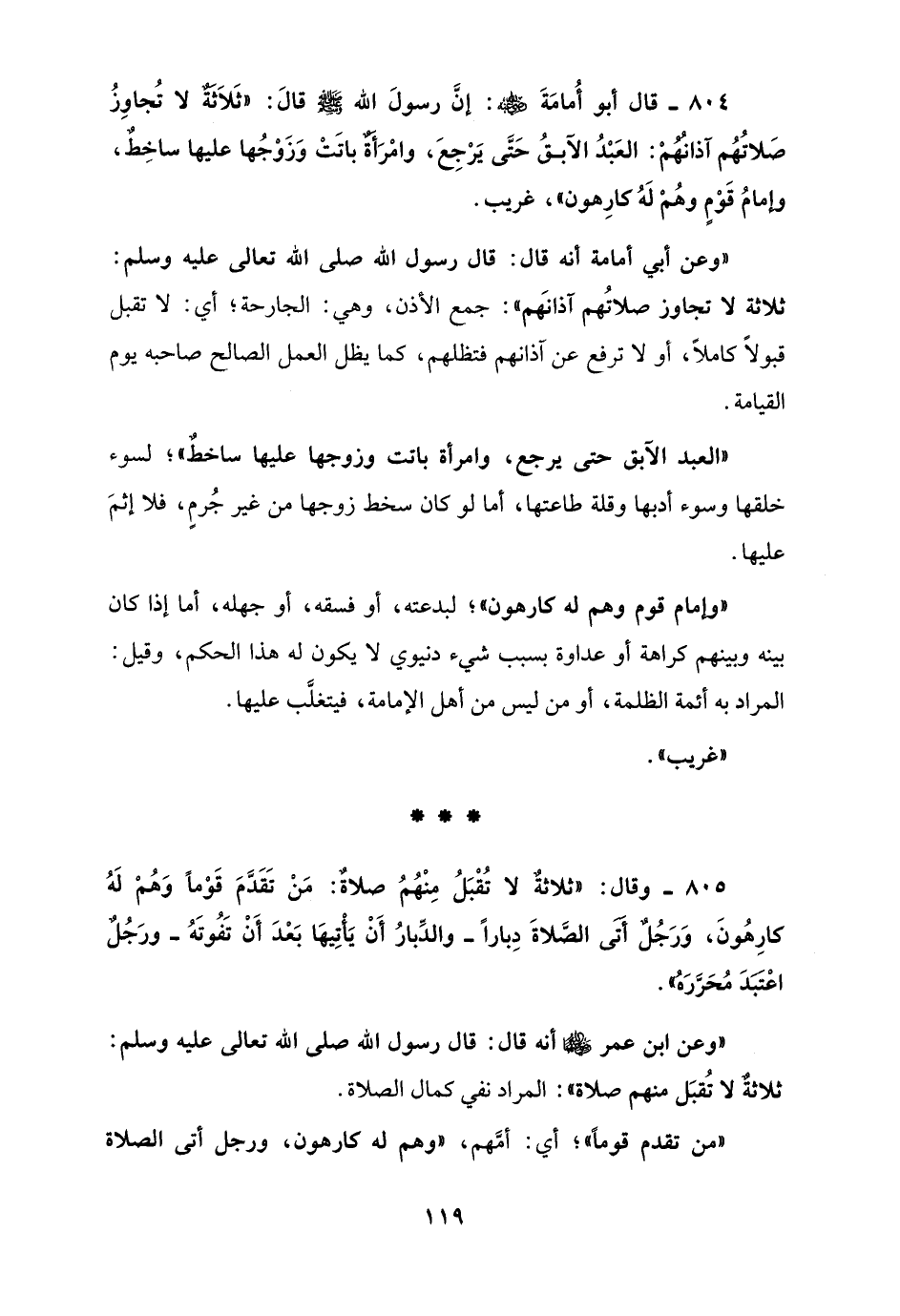 804 - قال أبو أُمامَةَ - رضي الله عنه -: إنَّ رسولَ الله - صلى الله عليه وسلم - قالَ: "ثَلَاثة لا تُجاوِزُ صَلاتُهُم آذانُهُمْ: العَبْدُ الآبقُ حَتَّى يَرْجِعَ، وامْرَأةٌ باتَتْ وَزَوْجُها عليها ساخِطٌ، وإمامُ قَوْمٍ وهُمْ لَهُ كارِهون"، غريب.