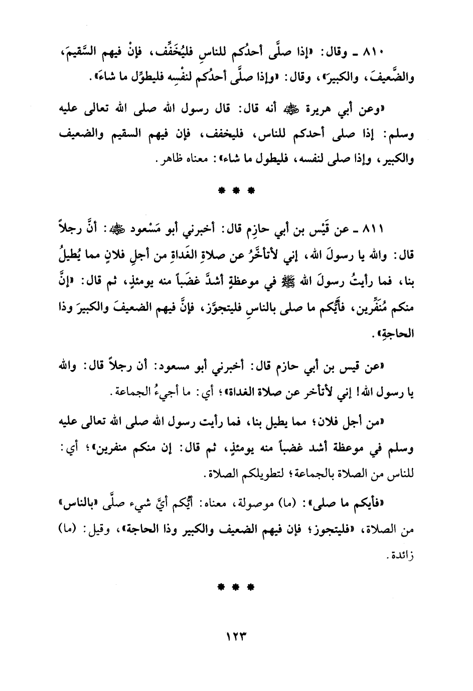 811 - عن قَيْس بن أبي حازِم قال: أخبرني أبو مَسْعود - رضي الله عنه -: أنَّ رجلًا قال: والله يا رسولَ الله، إني لأتأخَّرُ عن صلاةِ الغَداةِ من أجلِ فلانٍ مما يُطيلُ بنا، فما رأيتُ رسولَ الله - صلى الله عليه وسلم - في موعظةٍ أشدَّ غضَبًا منه يومئذٍ، ثم قال: "إنَّ منكم مُنَفِّرين، فأَيُّكم ما صلى بالناسِ فليتجوَّز، فإنَّ فيهم الضعيفَ والكبيرَ وذا الحاجةِ".