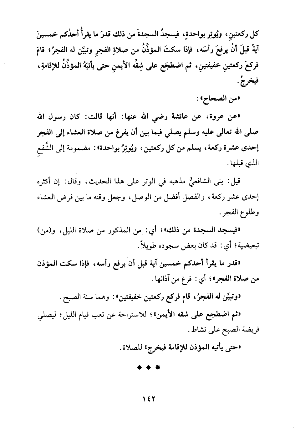 " عن عروة، عن عائشة رضي الله عنها: أنها قالت: كان رسول الله صلى الله تعالى عليه وسلم يصلي فيما بين أنَّ يفرغ من صلاة العشاء إلى الفجر إحدى عشرة ركعة، يسلم من كل ركعتين، ويُوتِرُ بواحدة": مضمومة إلى الشَّفعِ الذي قبلها.