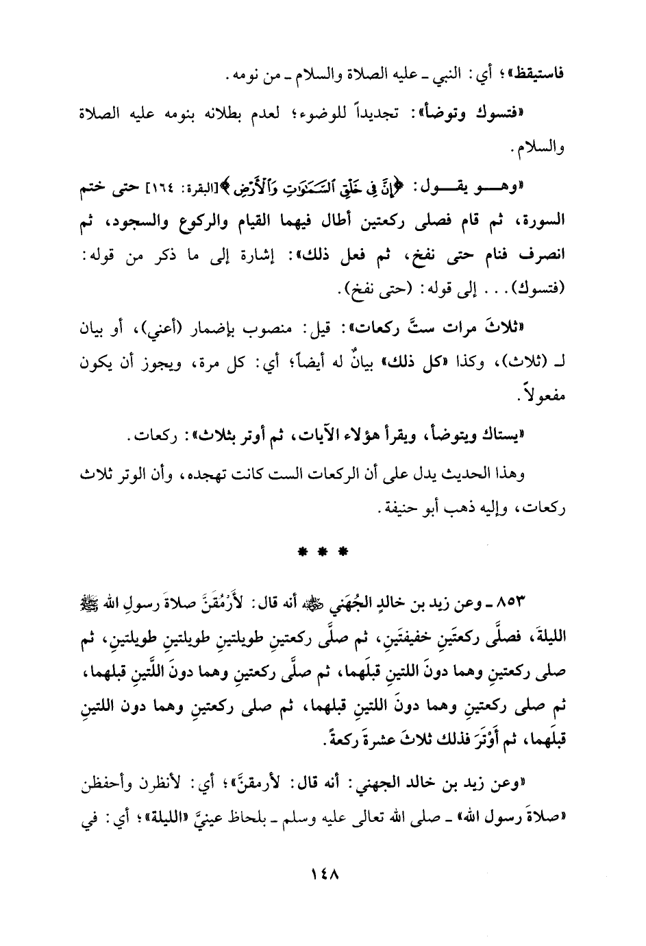 853 - وعن زيد بن خالدٍ الجُهَني - رضي الله عنه - أنه قال: لأَرْمُقَنَّ صلاةَ رسولِ الله - صلى الله عليه وسلم - الليلةَ، فصلَّى ركعتَينِ خفيفتَينِ، ثم صلَّى ركعتينِ طويلتينِ طويلتينِ طويلتينِ، ثم صلى ركعتينِ وهما دونَ اللتينِ قبلَهما، ثم صلَّى ركعتينِ وهما دونَ اللَّتينِ قبلهما، ثم صلى ركعتينِ وهما دونَ اللتينِ قبلهما، ثم صلى ركعتينِ وهما دون اللتينِ قبلَهما، ثم أَوْتَرَ فذلك ثلاثَ عشرةَ ركعةً.