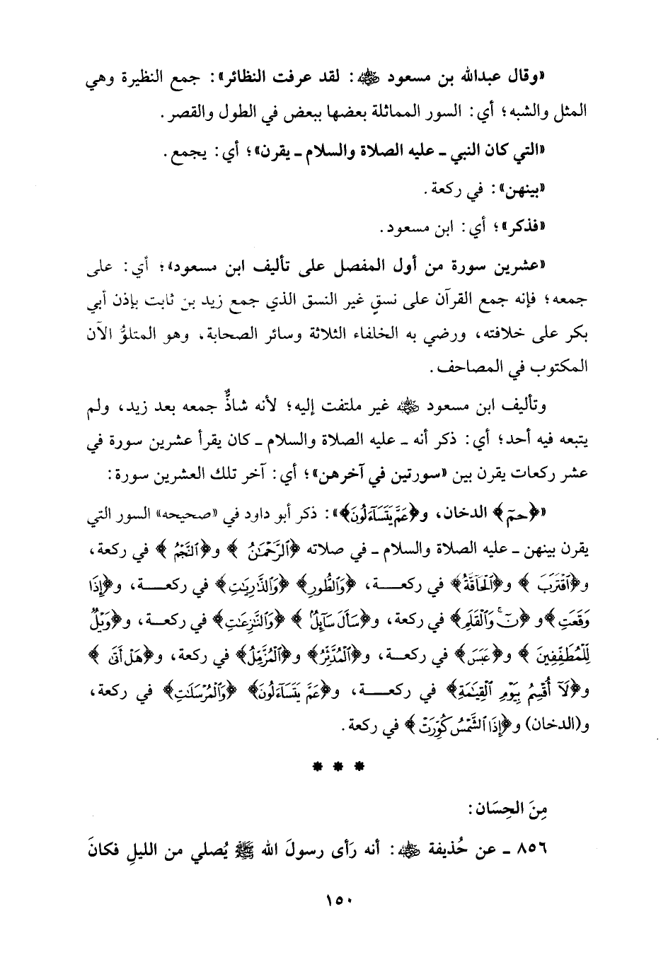 وتأليف ابن مسعود - رضي الله عنه - غير ملتفت إليه؛ لأنه شاذٌّ جمعه بعد زيد، ولم يتبعه فيه أحد؛ أي: ذكر أنه - عليه الصلاة والسلام - كان يقرأ عشرين سورة في عشر ركعات يقرن بين "سورتين في آخرهن"؛ أي: آخر تلك العشرين سورة: " {حم} الدخان، و {عَمَّ يَتَسَاءَلُونَ} ": ذكر أبو داود في "صحيحه" السور التي يقرن بينهن - عليه الصلاة والسلام - في صلاته {الرَّحْمَنُ} و {النَّجْمُ} في ركعة، و {اقْتَرَبَتِ} و {الْحَاقَّةُ} في ركعة، {وَالطُّورِ} {وَالذَّارِيَاتِ} في ركعة، و {إِذَا وَقَعَتِ} و {ن وَالْقَلَمِ} في ركعة، و {سَأَلَ سَائِلٌ} {وَالنَّازِعَاتِ} في ركعة، و {وَيْلٌ لِلْمُطَفِّفِينَ} و {عَبَسَ} في ركعة، و {الْمُدَّثِّرُ} و {الْمُزَّمِّلُ} في ركعة، و {هَلْ أَتَى} و {لَا أُقْسِمُ بِيَوْمِ الْقِيَامَةِ} في ركعة، و {عَمَّ يَتَسَاءَلُونَ} {وَالْمُرْسَلَاتِ} في ركعة، و (الدخان) و {إِذَا الشَّمْسُ كُوِّرَتْ} في ركعة.