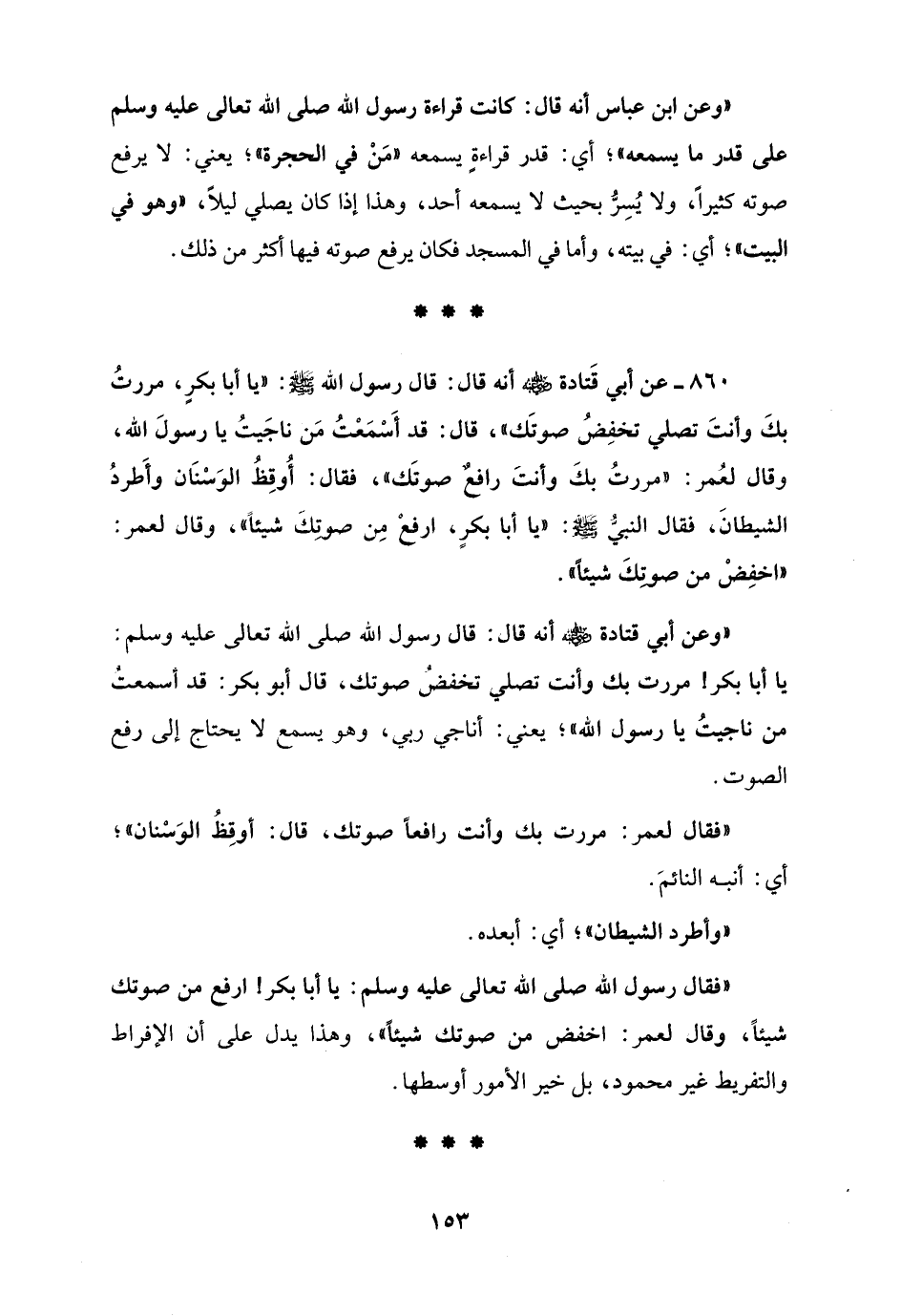 860 - عن أبي قَتادة - رضي الله عنه - أنه قال: قال رسول الله - صلى الله عليه وسلم -: "يا أبا بكرٍ، مررتُ بكَ وأنتَ تصلي تخفِضُ صوتَك"، قال: قد أَسْمَعْت مَن ناجَيتُ يا رسولَ الله، وقال لعُمر: "مررتُ بكَ وأنتَ رافعٌ صوتَك"، فقال: أُوقِظُ الوَسْنَان وأَطردُ الشيطانَ، فقال النبيُّ - صلى الله عليه وسلم -: "يا أبا بكرٍ، ارفعْ مِن صوتِكَ شيئًا"، وقال لعمر: "اخفِضْ من صوتِكَ شيئًا".