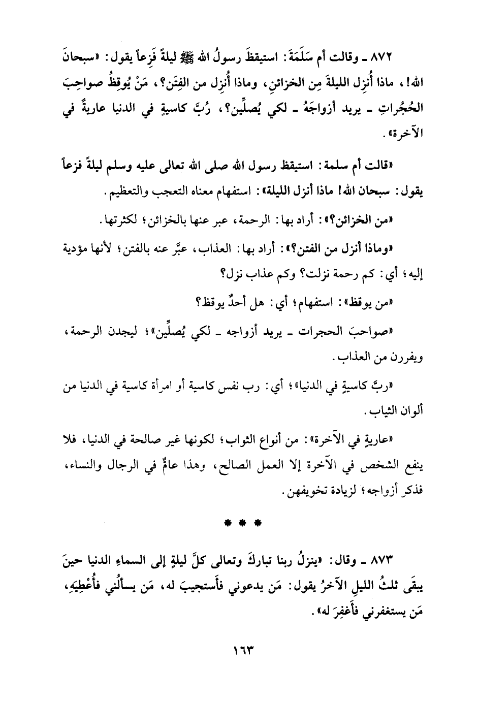 872 - وقالت أم سَلَمَةَ: استيقظَ رسولُ الله - صلى الله عليه وسلم - ليلةً فَزِعًا يقول: "سبحانَ الله!، ماذا أُنزِل الليلةَ مِن الخزائنِ، وماذا أُنزِل من الفِتَن؟، مَنْ يُوقِظُ صواحِبَ الحُجُراتِ - يريد أزواجَهُ - لكي يُصلِّين؟، رُبَّ كاسيةٍ في الدنيا عاريةٌ في الآخرة".