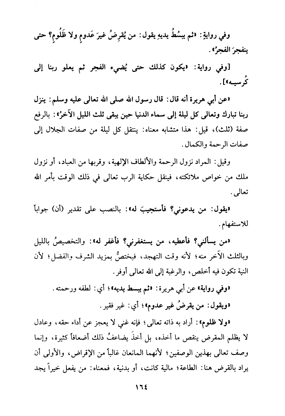 وفي روايةٍ: "ثم يبسُطُ يديهِ يقول: من يُقرِضُ غيرَ عَدومٍ ولا ظَلُوم؟ حتى ينفجرَ الفجرُ".