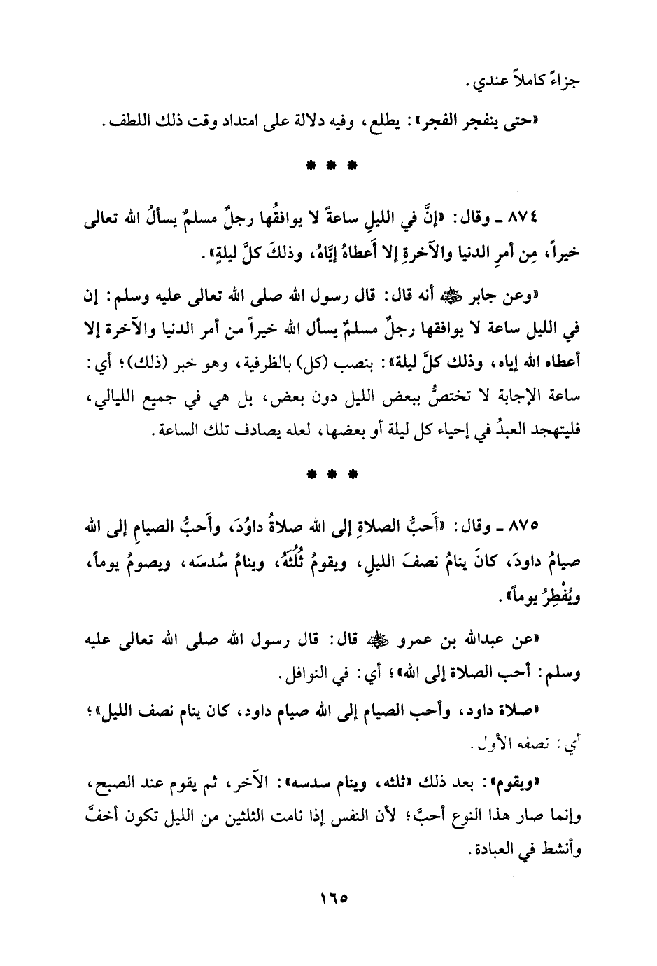 875 - وقال: "أَحبُّ الصلاةِ إلى الله صلاةُ داوُدَ، وأَحبُّ الصيامِ إلى الله صيامُ داودَ، كانَ ينامُ نصفَ الليلِ، ويقومُ ثُلُثَهُ، وينامُ سُدسَه، ويصومُ يومًا، ويُفْطِرُ يومًا".