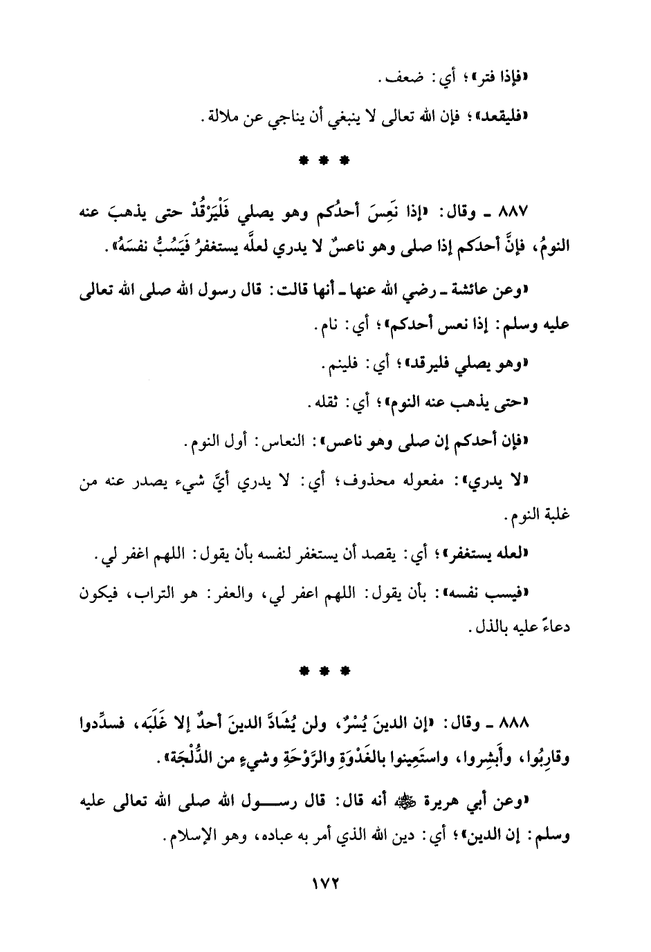 888 - وقال: "إن الدينَ يُسْرٌ، ولن يُشَادَّ الدينَ أحدٌ إلا غَلَبَه، فسدِّدوا وقارِبُوا، وأَبشِروا، واستَعِينوا بالغَدْوَةِ والرَّوْحَةِ وشيءٍ من الدُّلْجَة".