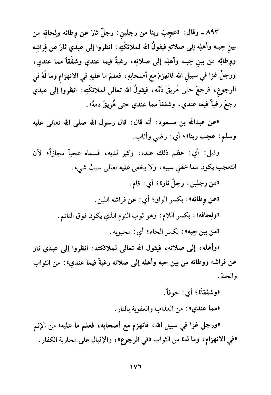 893 - وقال: "عجِبَ ربنا من رجلينِ: رجلٌ ثارَ عن وِطائه ولِحافِه من بينِ حِبه وأهلِه إلى صلاتهِ فيقولُ الله لملائكَتِه: انظروا إلى عبدي ثارَ عن فِراشِه ووِطائِه من بينِ حِبه وأهلِه إلى صلاتِه، رغبةً فيما عندي وشفَقًا مما عندي، ورجلٌ غزا في ممبيلِ الله فانهزمَ مع أصحابهِ، فعلمَ ما عليهِ في الانهزامِ وما لَهُ في الرجوعِ، فرجعَ حتي هُريقَ دَمُه، فيقولُ الله تعالى لملائكَتِه: انظروا إلى عبدي رجعَ رغبةً فيما عندي، وشفقًا مما عندي حتى هُريقَ دمهُ".