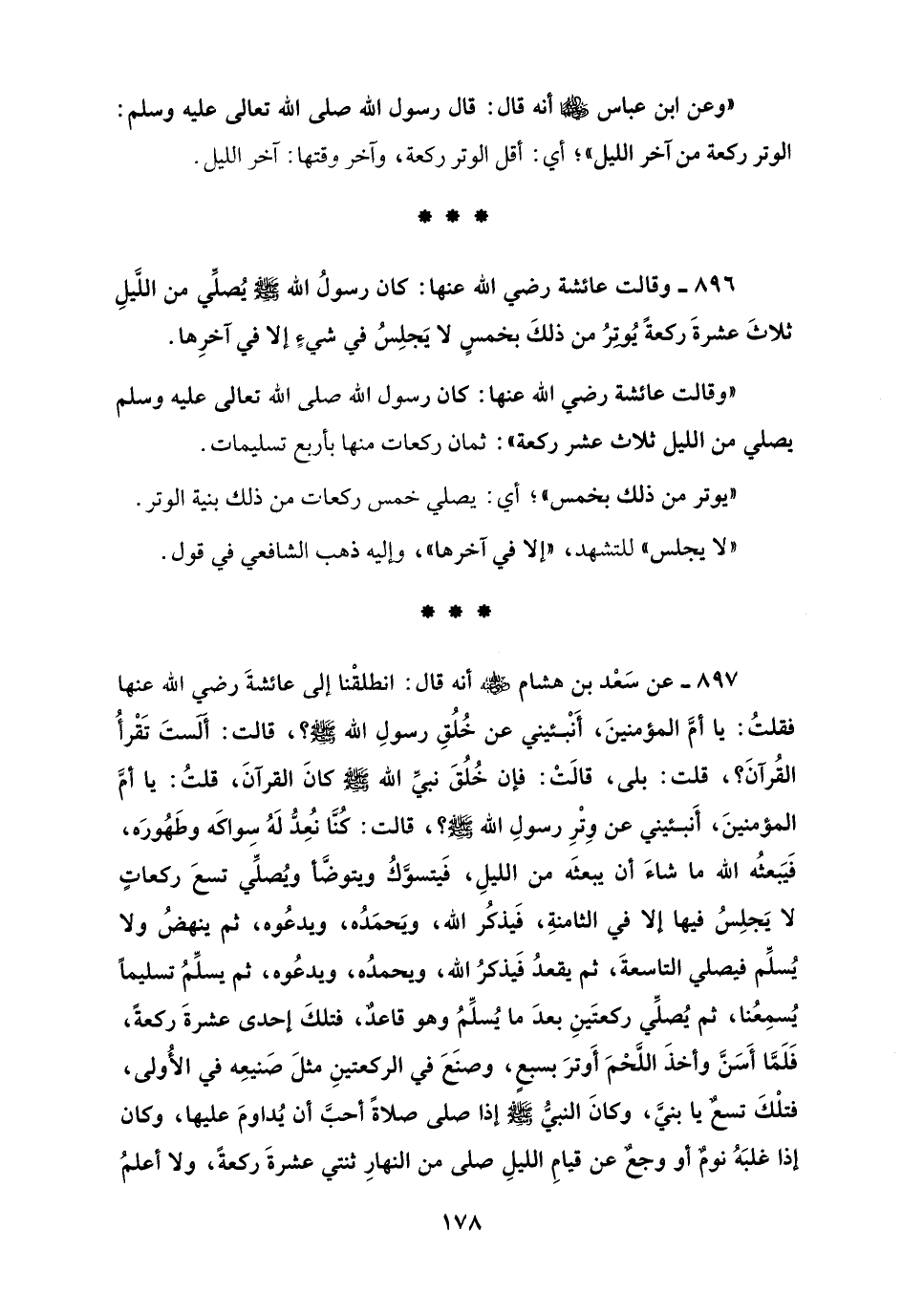 897 - عن سَعْد بن هشام - رضي الله عنه - أنه قال: انطلقْنا إلى عائشةَ رضي الله عنها فقلتُ: يا أمَّ المؤمنينَ، أَنْبئيني عن خُلُقِ رسولِ الله - صلى الله عليه وسلم -؟، قالت: أَلَستَ تَقْرأُ القُرآنَ؟، قلت: بلى، قالَت: فإن خُلُقَ نبيِّ الله - صلى الله عليه وسلم - كانَ القرآنَ، قلتُ: يا أمَّ المؤمنينَ، أَنبئيني عن وِتْرِ رسولِ الله - صلى الله عليه وسلم -؟، قالت: كُنَّا نُعِدُّ لَهُ سواكَه وطَهُورَه، فَيَبعثُه الله ما شاءَ أن يبعثَه من الليلِ، فَيتسوَّكُ ويتوضَّأ ويُصلِّيَ تسعَ ركعاتٍ لا يَجلِسُ فيها إلا في الثامنةِ، فَيذكُر الله، ويَحمَدُه، ويدعُوه، ثم ينهضُ ولا يُسلِّم فيصلي التاسعةَ، ثم يقعدُ فَيذكرُ الله، ويحمدُه، ويدعُوه، ثم يسلِّمُ تسليمًا يُسمِعُنا، ثم يُصلِّي ركعتَينِ بعدَ ما يُسلِّمُ وهو قاعدٌ، فتلكَ إحدى عشرةَ ركعةً، فَلَمَّا أَسَنَّ وأخذَ اللَّحْمَ أَوترَ بسبعٍ، وصنَعَ في الركعتينِ مثلَ صَنيعِه في الأُولى، فتلْكَ تسعٌ يا بنيَّ، وكانَ النبيُّ - صلى الله عليه وسلم - إذا صلى صلاةً أحبَّ أن يُداومَ عليها، وكان إذا غلبَهُ نومٌ أو وجعٌ عن قيامِ الليلِ صلى من النهارِ ثنتي عشرةَ ركعةً، ولا أعلمُ