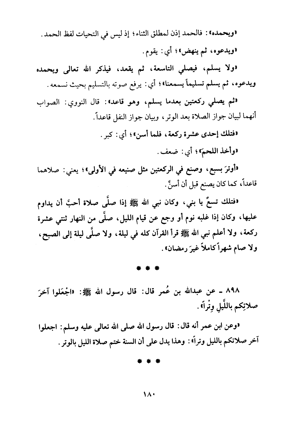 898 - عن عبد الله بن عُمر قال: قال رسول الله - صلى الله عليه وسلم -: "اجْعَلوا آخرَ صلاتِكم باللَّيلِ وِتْرًا".