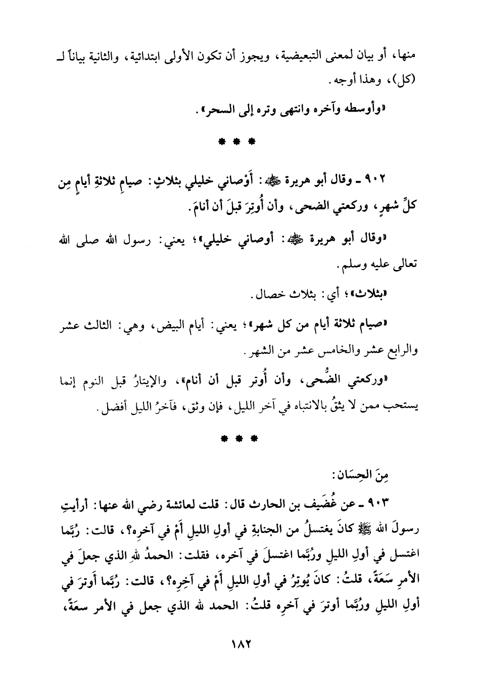 902 - وقال أبو هريرة - رضي الله عنه -: أَوْصاني خليلي بثلاثٍ: صيامِ ثلاثةِ أيامٍ مِن كلِّ شهرٍ، وركعتي الضحى، وأن أُوتِرَ قبلَ أن أنامَ.