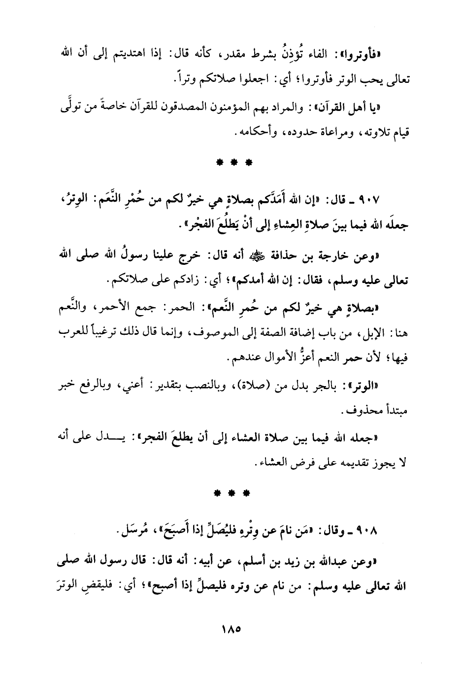 907 - قال: "إن الله أَمَدَّكم بصلاة هي خيرٌ لكم من حُمْرِ النَّعَم: الوِترُ، جعلَه الله فيما بينَ صلاةِ العِشاءِ إلى أنْ يَطلُعَ الفجْر".