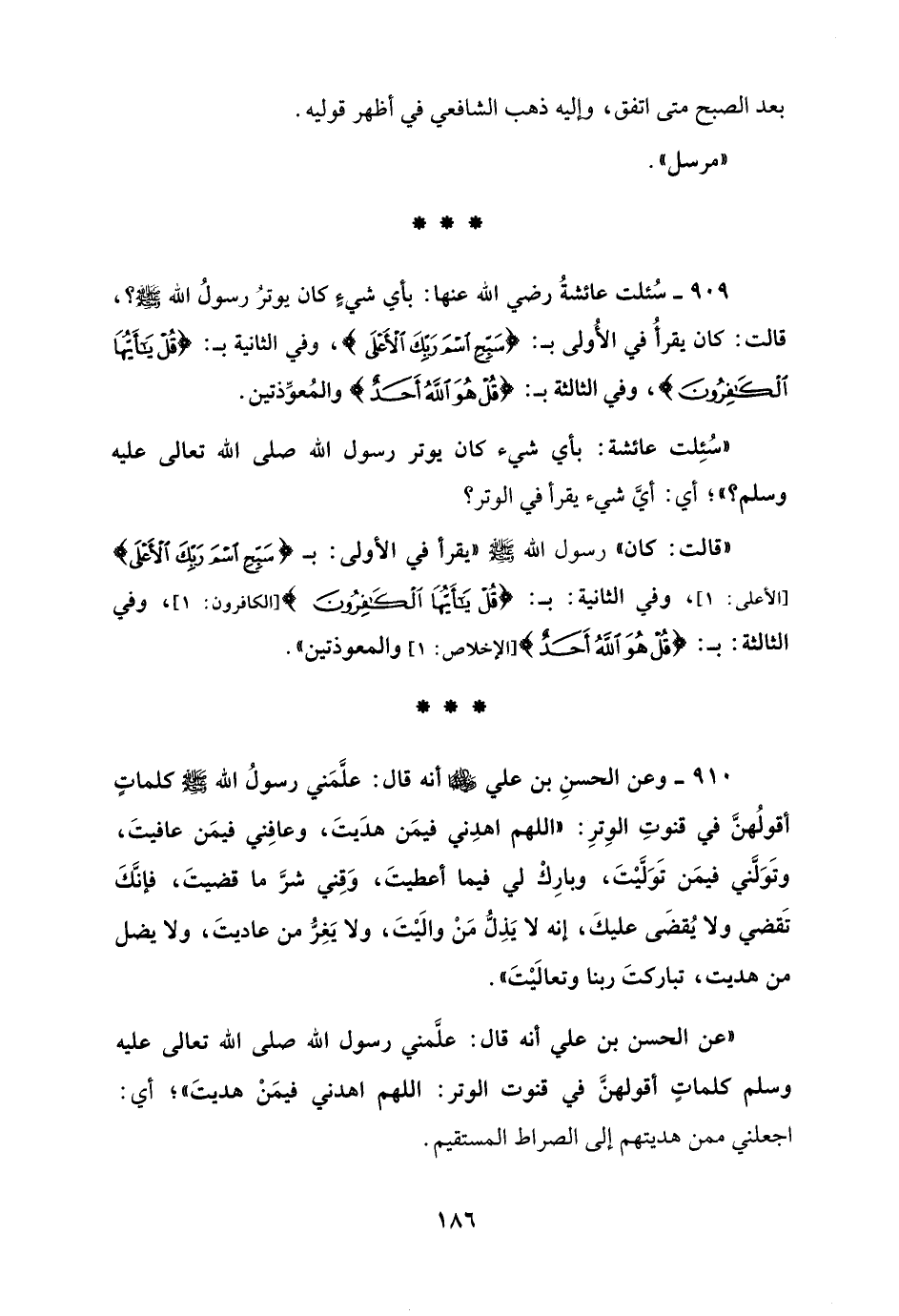 909 - سُئلت عائشةُ رضي الله عنها: بأي شيءٍ كان يوترُ رسولُ الله - صلى الله عليه وسلم -؟، قالت: كان يقرأُ في الأُولى بـ: {سَبِّحِ اسْمَ رَبِّكَ الْأَعْلَى}، وفي الثانية بـ: {قُلْ يَاأَيُّهَا الْكَافِرُونَ}، وفي الثالثة بـ: {قُلْ هُوَ اللَّهُ أَحَدٌ} والمُعوِّذتين.
