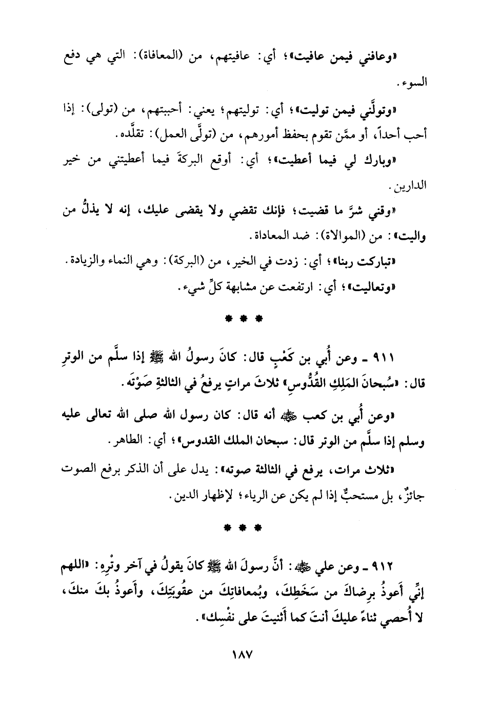 911 - وعن أُبي بن كَعْبٍ قال: كانَ رسولُ الله - صلى الله عليه وسلم - إذا سلَّم من الوترِ قال: "سُبحانَ المَلِكِ القُدُّوسِ" ثلاثَ مراتٍ يرفعُ في الثالثةِ صَوْتَه.