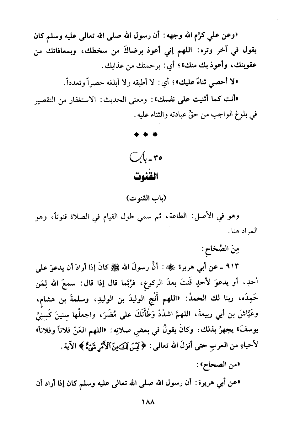 "وعن علي كرَّم الله وجهه: أن رسول الله صلى الله تعالى عليه وسلم كان يقول في آخر وتره: اللهم إني أعوذ برضاكَ من سخطك، وبمعافاتك من عقوبتك، وأعوذ بك منك"؛ أي: برحمتك من عذابك.