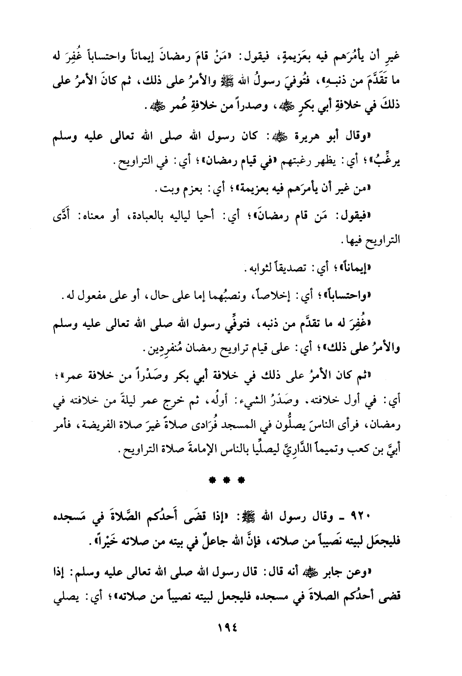 920 - وقال رسول الله - صلى الله عليه وسلم -: "إذا قضَى أَحدُكم الصَّلاةَ في مَسجده فليجعَل لبيته نصَيبًا من صلاته، فإنَّ الله جاعلٌ في بيته من صلاته خَيْرًا".